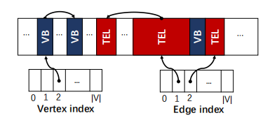 而邻边有序集方面,根据设计思想一节中介绍的指导思想,不需要将邻边有序集都存储在连续物理内存,可以用块大小较大的链式块达到近似的处理速度。因此Sortledton选择松散链表,支持对数级别的查询更新的同时,维护边的有序性并避免类似B+ Tree的rebalance操作。