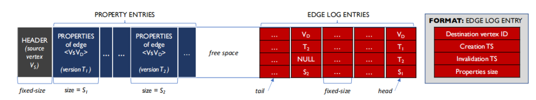 TEL内部的结构如下图所示,除了开头固定长度的元数据外,相关边与对应属性在一个倍增的动态扩容数组中分别从两头往中间增长。最新的数据被存储在最中间。这种布局保证了扫描一个邻域时是顺序访问内存的。此外,LiveGraph在基础数据结构中就实现了多版本存储:每个边在被删除或更新时,并不是直接在动态数组中删除该边及属性,而是修改该边的无效时间戳Invalidation TS,存储下这条边的历史数据。