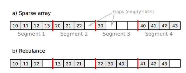 如上图所示,PMA是带有空隙的数组,将之分成若干segment。插入时优先插入segment中的空隙,若segment满时则联合周围若干segment执行rebalance,元素过多时可能执行数组的倍增。每次更新的最差效率为O(logN)^2,均匀分布的均摊效率是O(logN)。参数的设置可以保证rebalance段的填充率约为75%,而整体数组的填充率为50%。