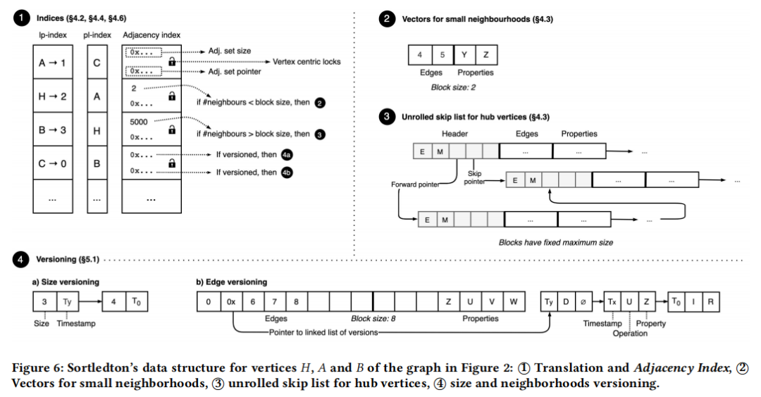 为了实现多版本存储,Sortledton在每个边维护的信息中加入一个版本链指针,并实现了一个传统的版本链维护。Sortledton的整体存储架构如下图所示,包括一个二级数组实现的动态索引,基于松散链表存储的每个点邻域与对应的版本链存储。