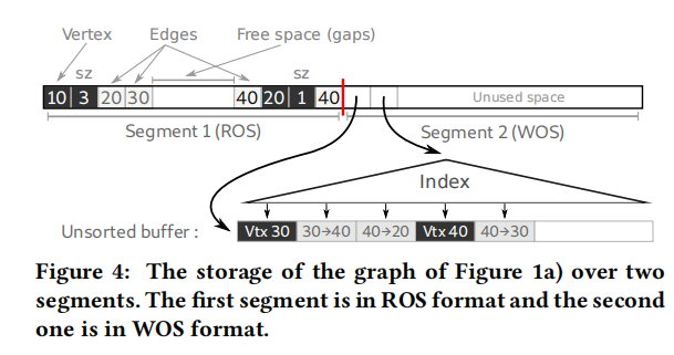 Teseo将segment分为读优化段ROS和写优化段WOS,如下图所示。初始段模式为ROS,在segment的两边存储数据。插入时需要挪动数据。为了防止更新偏斜的最差情况,段满时以延迟D执行rebalance。为此需要一个机制存储多余的数据:WOS段模式。WOS段模式利用段外的buffer和段内的索引存储数据,数据为<src,dst>,索引为ART tree。