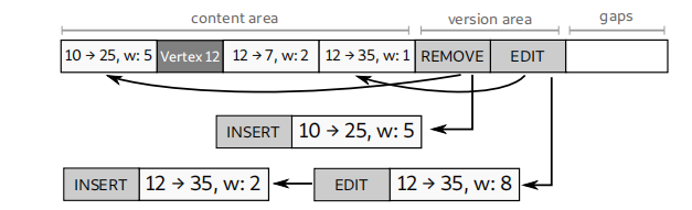 为了支持事务的并发,每个segment具有一个hybrid latch。携带一个版本标记的读写锁,读数据时乐观地可以选择不加读锁,而通过对比版本确保无人修改数据。为了防止死锁,Teseo的只读事务会获得传统的读锁存器。而读写事务的读操作则只能获取乐观模式的锁存器。由于Fat-Tree需要执行若干叶子中segment的rebalance,需要计算segment的长度。因此叶子节点还需要添加一个锁存器。二级索引使用的哈希表使用了无锁实现,同样可以保证线程安全。同时,在每个存储数组后面添加一个版本区域,以版本链的形式将数据的所有版本串联在一起,如下图所示。Teseo的事务执行逻辑基本与Hyper类似。