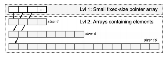 由于不需要优化所有邻域的访问模式,Sortledton采取邻接表的形式,以简化结构。如背景介绍中描述的,邻接表主要分为两个部分:点到边集的映射与某个点的邻边有序集。Sortledton的点边映射采用的两级数据如上图所示,第一级存储第二级数组的指针,每次扩容时新增一个大小翻倍的第二级数组。