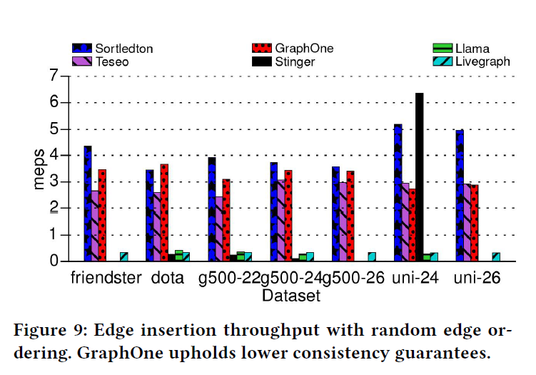 第一部分的测试比较插入的性能,对比的对象分别为Teseo,LiveGraph,GraphOne,Llama以及Stringer。插入的同时要求先查询该边是否存在。下图中存在巨大性能差异时主要由于存在性检测导致的:Teseo和Sortledton的边集有序,因此可以快速查询存在性;GraphOne不支持存在性查询。因此它们与另外三个系统存在较大的性能差异。