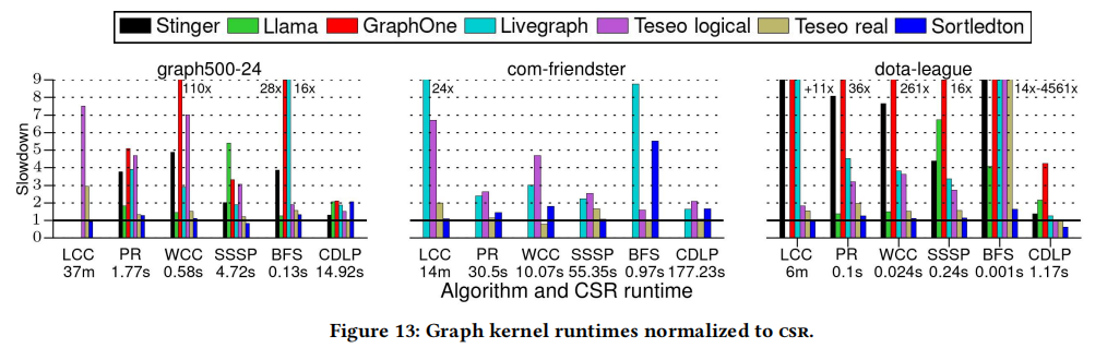 第二部分的实验是针对图算法的实验,主要比较的图算法包括局部集聚系数LCC、单源最短路SSSP、广度优先搜索BFS、弱连通分量WCC、基于标签传播的社区检测CDLP和PageRank。并且以CSR作为baseline。可以看出Teseo和Sortledton在各算法表现中较好,其中Sortledton更胜一筹。值得注意的是,LCC由于需要执行交集操作,只有维护有序集的Teseo和Sortledton才能在有效时间内执行。