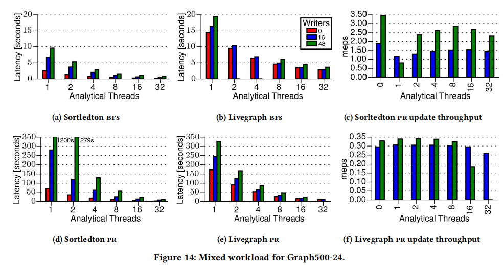 第三部分的实验是针对事务系统的实验,因此只有对支持事务的Teseo和LiveGraph系统的对比,其中Teseo由于在Sortledton进行实验期间存在bug,因此只有与LiveGraph的对比。可以看出,在线程数较少时,Sortledton的性比对LiveGraph有较大的优势,与第二部分的实验一致。但线程数较多时,两者在PR上的性能差距不大。这是因为LiveGraph的多版本是顺序存储的,而Sortledton需要遵循版本链,存在不连续的内存空间。