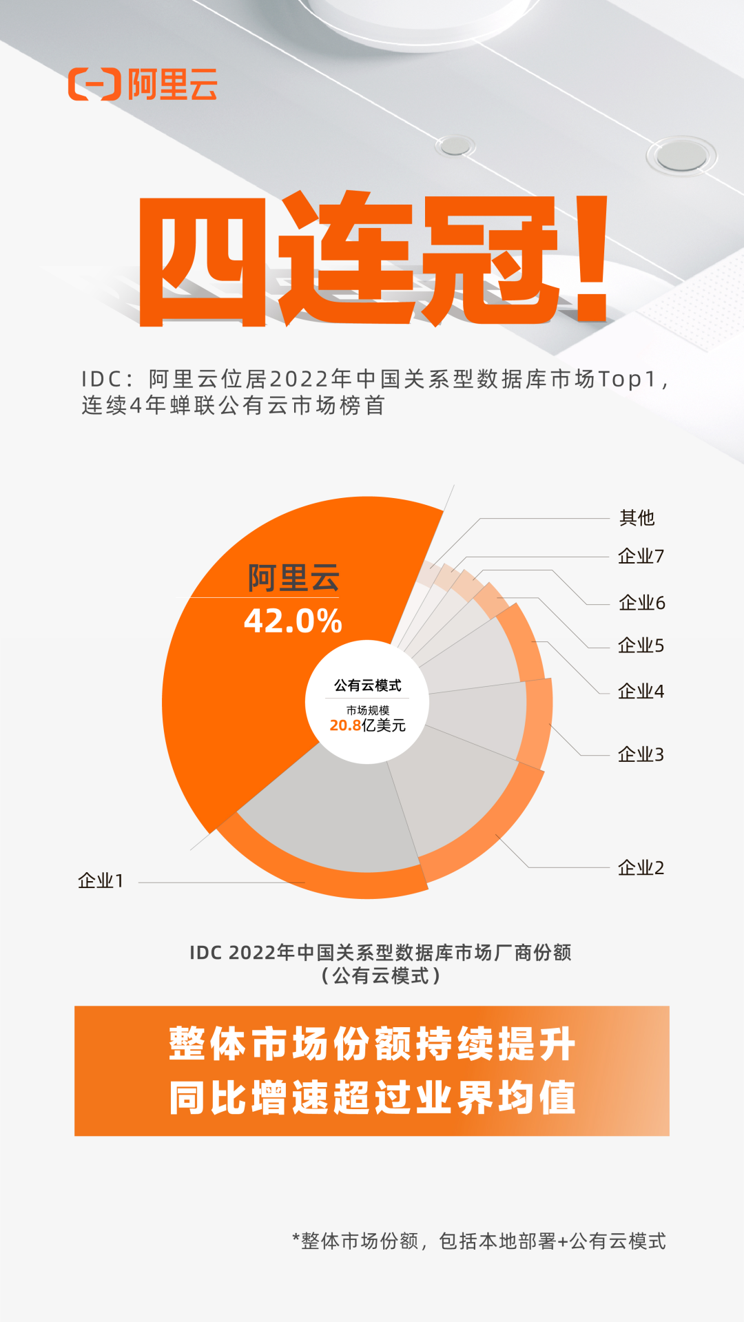 在中国关系型数据库市场,阿里云继续领跑,连续第3年稳居全年首位。2022年度,阿里云整体市场份额(公有云+本地部署模式)达到27.1%,份额持续提升,增速远高于市场平均水平;在增速最快的公有云部署市场上,阿里云以42%的份额连续4年蝉联第一,市场份额大于第2到4名的总和,持续彰显领先优势。