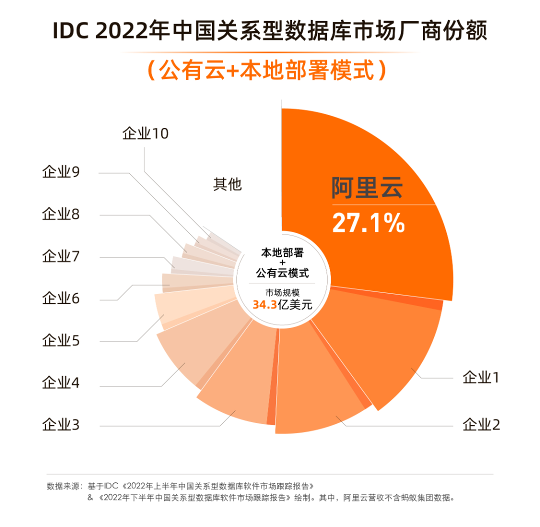 图说:2022年中国公有云关系型数据库市场,阿里云绝对优势夺冠根据IDC报告,2022年中国关系型数据库软件市场规模达到34.3亿美元,其中,公有云关系型数据库规模增长至20.8亿美元,在整体市场中首次占比突破60%;预计到2027年,整体市场规模将达到102.7亿美元,未来5年市场年复合增长率为24.5%。