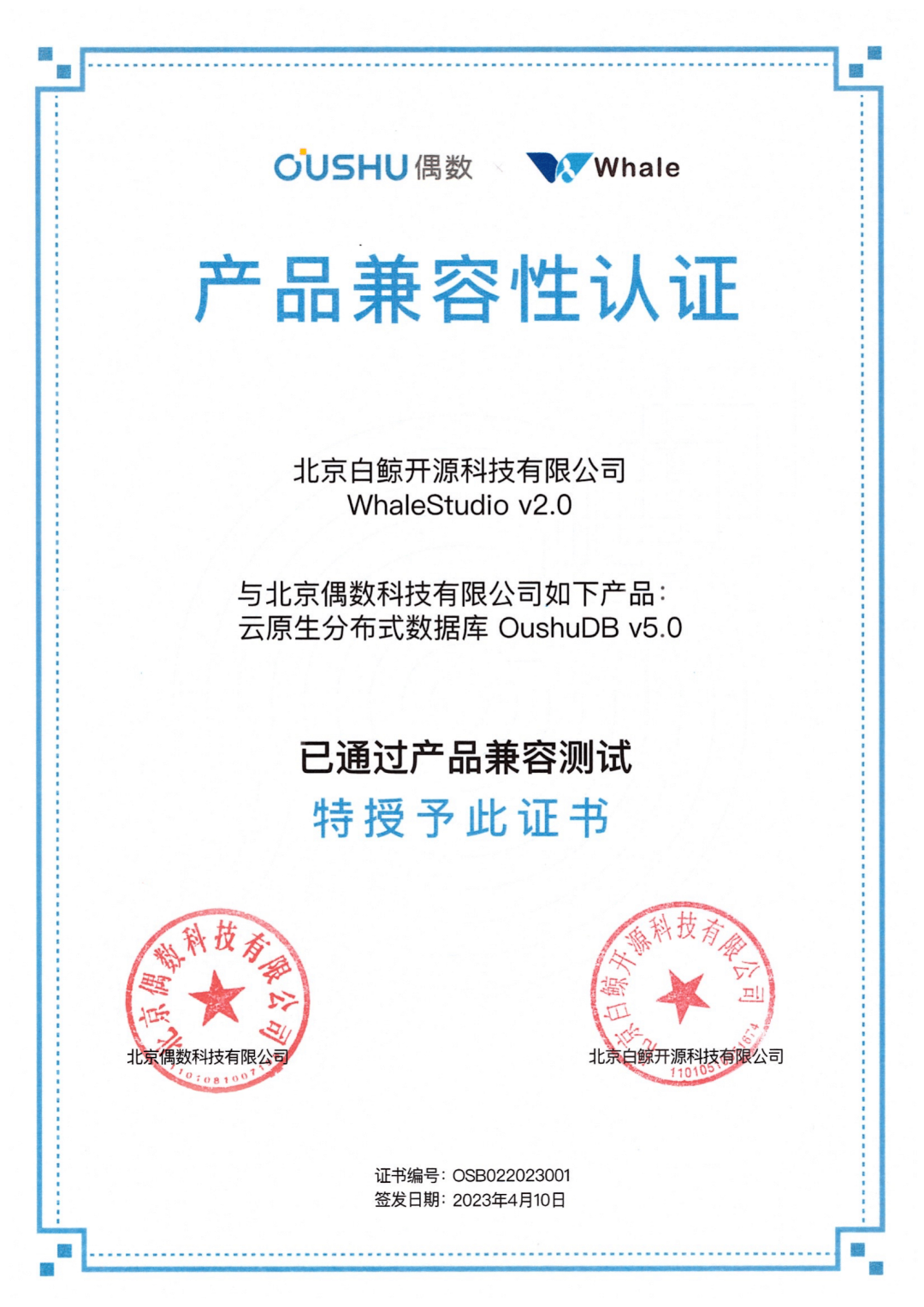 近日,偶数科技自主研发的云原生分布式数据库 OushuDB v5.0 完成了与白鲸开源集成调度工具 WhaleStudio v2.0 的兼容性相互认证测试。