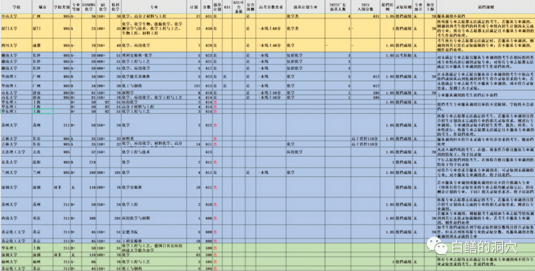 对于化学,我就不大熟悉了。不过根据我儿子的历史成绩,以及化学专业高校的情况,我还是认真做了一张表格。这张表格是为了报考化学专业,成绩在580-630之间的考生报考用的。如果正好有朋友的孩子喜欢化学,也可以参考一下。