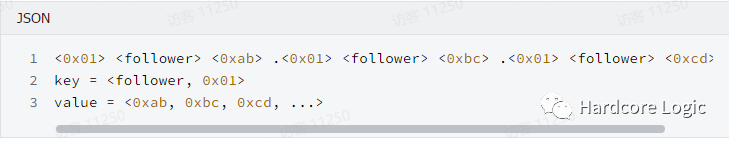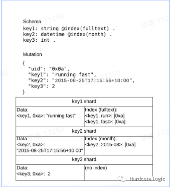 三元组通常表现为<主-谓-宾>或者<主-谓-值>,主语是一个节点,谓语表示关系,宾语可以是另一个节点或者是某个原始类型的值,谓语表示一种有方向的边,从主语指向宾语或者指向一个值。在上面的例子中name三元组是<主-谓-值>,而follower三元组则是<主-谓-宾>的类型。Dgraph 在处理这两种类型的记录时没有区别,在内部这被认为是一种记录单位,一个典型的json记录将被拆分为多个这样的记录单位。