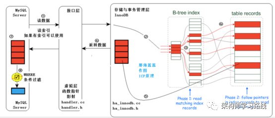 3、然后where条件会在B-tree index这部分进行索引匹配,如果命中索引,就会定位到指定的table records位置。如果没有命中,则只能采用全部扫描的方式