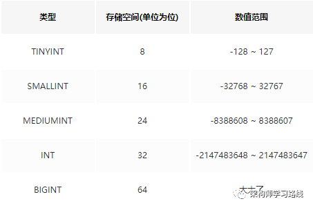 整数类型有TINYINT,SMALLINT,MEDIUMINT,INT,BIGINT,存储空间及数值范围如下表: