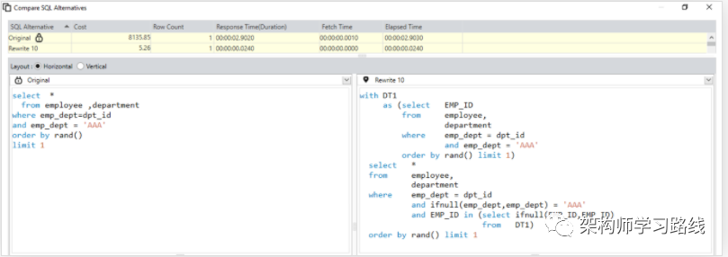 右边的 SQL 改写,比源 SQL 快了 100 倍