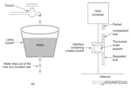 漏桶(Leaky Bucket)算法思路很简单,水(请求)先进入到漏桶里,漏桶以一定的速度出水(接口有响应速率),当水流入速度过大会直接溢出(访问频率超过接口响应速率),然后就拒绝请求,可以看出漏桶算法能强行限制数据的传输速率.示意图如下: