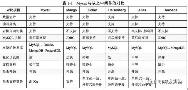 Mycat与以上中间件的对比如表1-1所示。