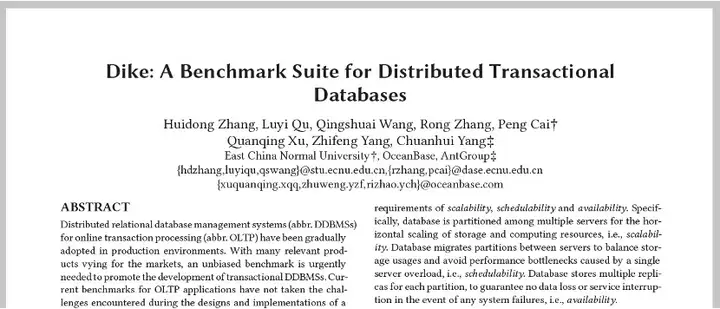 同时,OceanBase 和华东师范大学深度合作的研究成果《Dike: A Benchmark Suite for Distributed Transactional Databases》,也被 SIGMOD 2023 Demo Paper 收录。