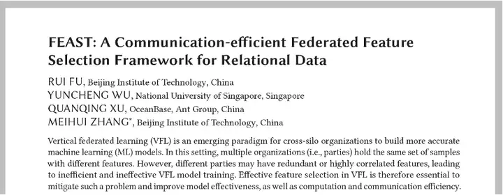 OceanBase 与北京理工大学、新加坡国立大学的最新联合研究成果《FEAST: A Communication-efficient Federated Feature Selection Framework for Relational Data》, 被 SIGMOD 2023 Research Paper(研究类论文)收录。