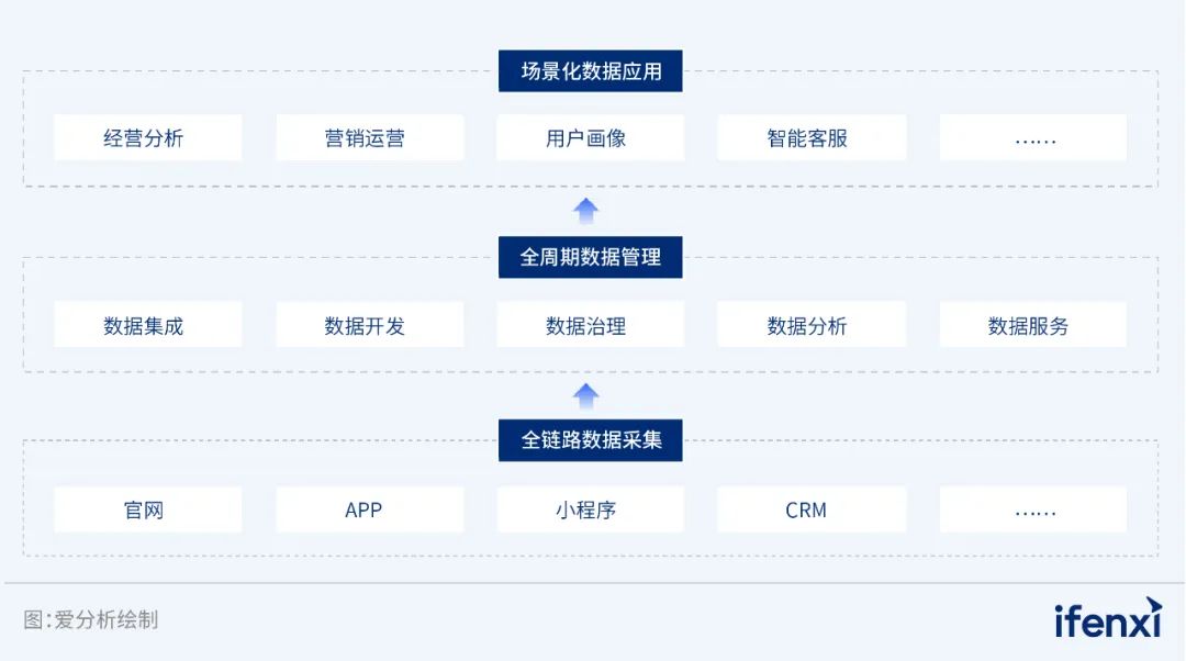 政策层面,各级政府助推数据化建设,力促数据要素价值充分释放。从2020年首次明确数据要素市场发展,到2022年《“十四五”数字经济发展规划》、《关于构建数据基础制度更好发挥数据要素作用的意见》的正式发布,国家密集出台了多项与数据要素相关的政策,整体聚焦以数据安全为前提、完善数据要素产权配置、强化数据要素治理等内容,加快推动数据要素市场规范化发展,促进数据要素潜能进一步释放。需求层面,伴随“以客户为中心”的发展时代到来,企业迫切需要挖掘客户数据价值,通过对数据的洞察、分析与决策帮助企业实现业务创新升级,打造可持续的数字化经营增长模式。例如,业务人员需要全流程的数据驱动,进行客户全生命周期的精细化管理,促进运营效率和效果提升。尤其面对近两年外部商业环境的快速变化,如何存好数据、管好数据、用好数据,实现数据赋能业务韧性发展,成为每个企业思考的重要课题。与此同时,大数据、人工智能、云计算等新兴技术的快速发展,也为数据与业务经营的深度融合奠定基础,支撑企业更高效完成数据采集、存储、加工、分析、应用的价值闭环,实现数据获取量更大、数据分析更加智能化、数据应用场景更加多元化。然而,现阶段企业在数据价值挖掘与应用过程中仍面临诸多挑战,阻碍了数据资产能力的持续提升。第一,数字化触点建设薄弱,无法实现全域数据统一收集。大部分企业数据零散分布在官网、APP、小程序等多个渠道,由于缺乏便捷有效的数据采集工具和数据连接能力,导致很多企业尚未建立全域触点数字化体系,无法实现交易数据、营销数据、客户行为数据、AIoT数据等的全面采集。第二,数据治理程度低,缺少高质量的数据资产沉淀。企业各部门的信息系统往往是分散建设,由于缺少统一的数据管理标准,不仅导致各业务部门采集数据存在口径不一致的问题,而且可能因为不规范的数据采集、存储、处理方式,导致产生异常数据、缺失数据等“脏数据”,从而影响数据资产的价值释放。并且,企业以往的数据治理工作多从单一目标出发,如配合顶层规划、数据平台建设,以及局部的专题治理等要求而进行,导致数据治理的实际效果并不理想。随着业务部门逐渐成为企业数字化的核心,统一数据规划和标准、满足业务部门的分析和应用需求成为企业数据治理的重要趋势。第三,数据应用场景受限,数据价值难以发挥。一方面,当前数据应用于企业内部经营分析、业务提效方面的价值凸显,但受限于数据规模和数据颗粒度粗,企业利用数据驱动精细化客户经营仍面临挑战。因此,企业需要利用技术将客户经营系统与数据系统打通,用数据指导进行客户触达,比如用数据优化广告投放的精准度,用数据帮助运营人员进行精细化客户运营,甚至是指导销售成单的话术沟通。另一方面,伴随数据应用场景的持续扩展,企业对于数据应用的实时性和智能化需求增加。如何基于实时数据快速实现数据分析和洞察,且具备自动化和智能预测能力,是促进企业数据价值释放的关键之一。面对爆炸式数据增长和数据应用难题,企业如何真正发挥数据价值、驱动自身业务长效可持续增长?通过深入调研企业最佳实践经验,认为构建全链路数据能力是解决企业数据难题的最优解,通过形成数据收集、数据治理及数据应用的完整数据智能服务生态闭环,真正让数据产生可持续的商业价值。