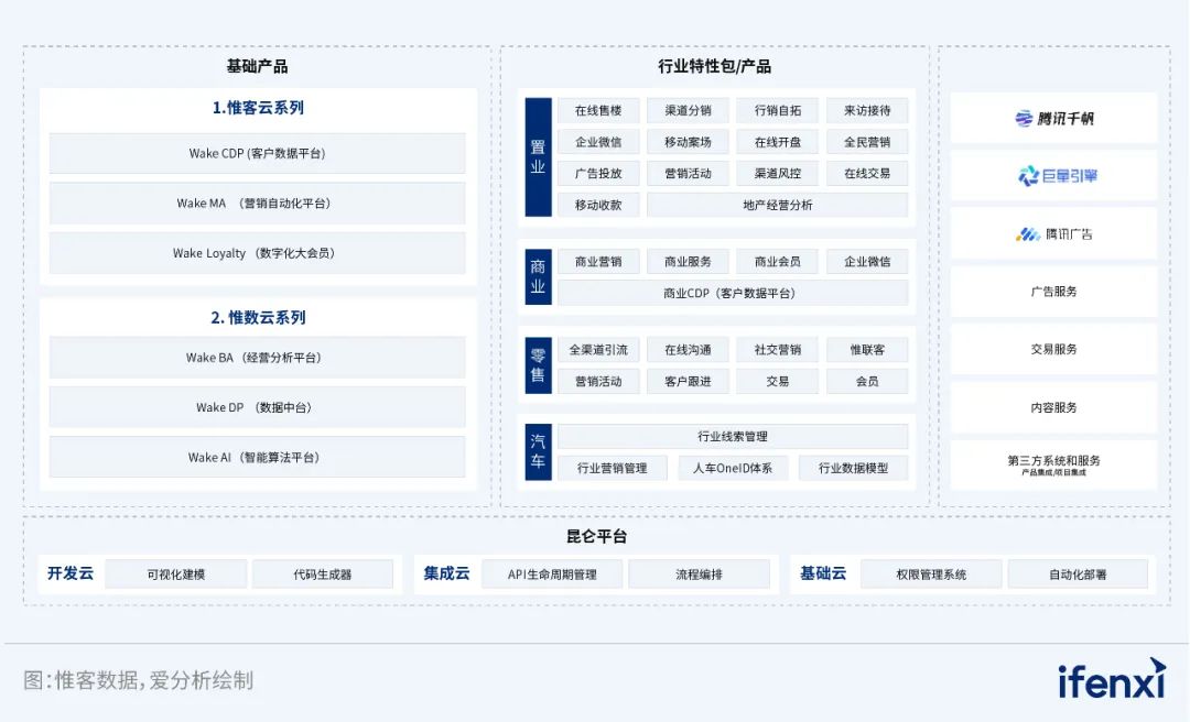 惟客数据成立于2018年,是一家以大数据和人工智能为核心的新一代数字化服务商。基于平台+应用+行业的数字化应用模式,惟客数据推出大数据和智能算法平台“惟数5.0”、 数字化客户经营平台“惟客5.0”、云原生技术底座“昆仑2.0”三大产品矩阵,以及泛地产、汽车、零售等行业化解决方案,帮助企业打造大数据和人工智能基础能力,并将数据智能能力赋能数字化业务发展。图3:惟客数据产品矩阵