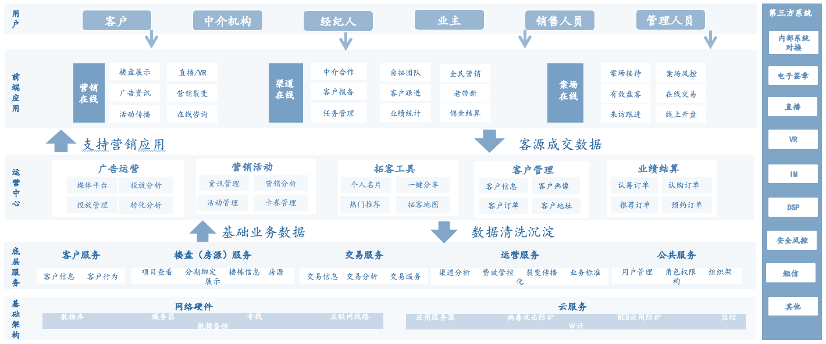全链路数据服务能力,支持端到端的数据价值实现。基于数据智能产品解决方案,惟客数据能够帮助企业建立从多元数据采集、数据治理、数据分析与挖掘、到驱动数据应用的全链路数据能力,为会员营销、数字化营销、导购销售、经营分析等行业应用场景提供更加精准、及时、智能的数据服务,从而实现数据与业务应用闭环管理,加速释放数据要素价值。例如,惟客云平台能够通过全域数据采集,帮助企业打通线上线下、公域私域的消费者数据,构建消费者分层、分群和标签画像,实现获客、留存、促活、成交、复购全生命周期精细化营销,形成端到端数据驱动的客户经营体系。同时,惟客数据将数据智能技术产品与泛地产、汽车、零售等特定行业的业务场景、需求痛点深度结合,能够为客户提供高场景贴合度的数字化解决方案。以经营分析场景为例,惟客数据能够根据不同行业特征制定专属的指标体系和运营模板,支撑企业进行多维度数据分析和经营决策。领先的底层技术能力,驱动数据智能产品持续升级。一方面,惟客数据多年来非常重视技术研发投入和创新,基于云原生高可用架构、领域模型驱动的设计模式及AI大模型,打造出专业的数据智能产品解决方案,兼具可拓展性强、安全性高、开发效率高等突出优势,已经得到行业很多头部企业的认可和应用。另一方面,在信创和国产化替代方面,惟客数据不断加大技术自研率和生态协作,实现对国产芯片、数据库、操作系统、芯片等的适配能力,以及对国外产品和技术的国产化替代。数字化运营服务能力,助力企业数据智能落地更敏捷。惟客数据基于丰富的行业实践经验和标杆客户案例,形成标准化实施方法论,能够面向客户提供方案设计咨询、本地化部署服务、系统运营实施服务等完整服务能力,助力项目快速落地。作为唤醒企业数据价值的实践先锋,惟客数据目前已在泛地产、零售、汽车等行业,面向客户经营、经营分析场景落地大量标杆实践案例,为加快驱动行业企业数据价值释放提供经验借鉴。案例1:数据驱动营销变革,某头部地产企业实现获客转化能力全面进阶需求痛点:某头部地产企业传统营销模式主要采用第三方SaaS工具和代运营服务,客户数据无法统一沉淀,难以实现全链路精准触达和营销降本增效。同时,随着渠道的强势崛起,该企业亟需搭建自有的数字营销阵地,逐步降低渠道依赖,沉淀私域客户资产,打造线上线下相结合的全方位客户服务能力,促进客户转化效率提升、销售业绩增长。解决方案:惟客数据为该头部地产企业搭建营销数字化平台,通过营销在线、渠道在线、案场在线三大场景升级,全面助推数字化营销转化能力提升。针对线上揽客场景,通过建立统一广告营销平台,一站式管理全渠道投放行为,并实时刷新、可视化呈现营销数据,有力支撑运营人员及时进行投放策略的优化迭代;针对渠道推客场景,通过交易结算流程透明化、拓客任务过程线上化,驱动全民经纪人广泛引流获客,大幅提升线下获客能力;针对案场转客场景,围绕从客户资源池、有效客户、意向客户到成交客户,建立在线开盘、渠道风控等标准案场处理流程,提升案场转化能力。图5:该头部地产企业的营销数字化平台架构
