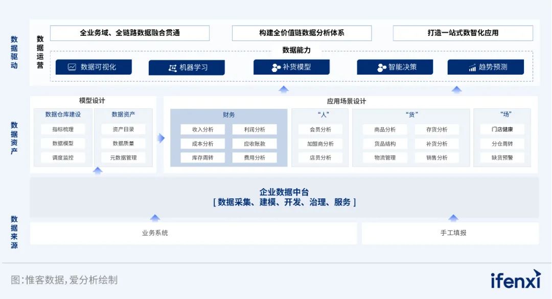 业务收益:营销数字化平台上线后,该头部地产企业能够基于客户数据的统一管理和分析,实现全链路营销策略触达和持续迭代,促进营销获客“获-渠-转”各环节效率的大幅提升。据统计,该平台上线仅一年时间,产生线索240万+,累计成交400亿+,全面支撑销售业绩目标达成。案例2:构建坚实数据底座,屈臣氏借助数据中台提升数据驱动决策能力需求痛点:作为一家全球布局10000多家门店的连锁零售先驱企业,屈臣氏很多关键运营数据统计分析结果需要T+1甚至T+2才能获取,销售端无法实时获取各渠道的库存信息,IT系统对实时数据处理的能力薄弱,导致企业难以实现智能化的需求预测、商品调配和补货、以及优化库存管理和补货流程。因此,提升底层数据实时处理能力、驱动数据赋能销售业务决策变得至关重要。解决方案:屈臣氏在惟客数据的帮助下成功上线数据中台,通过对库存相关业务系统进行数据集成、数据标准统一和实时数据指标计算,业务部门能够及时获取销售和库存数据,从而做出准确决策;基于数据服务平台,各业务部门能够轻松访问和利用数据,高效完成业务分析、报告生成等工作;此外,通过搭建经营可视化大屏,实时动态呈现公司销售、库存、补货等业务情况,为管理层提供直观精确的决策依据。图6:屈臣氏数据中台架构
