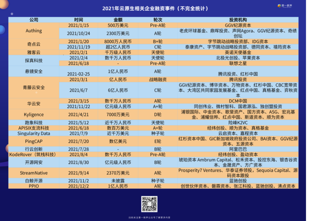 第一新声不完全统计,2021年国内云原生相关项目融资有40起,例如Authing、PingCAP、StreamNative等。可以预见,在云原生的驱动下,一个全云开发的时代正在到来。