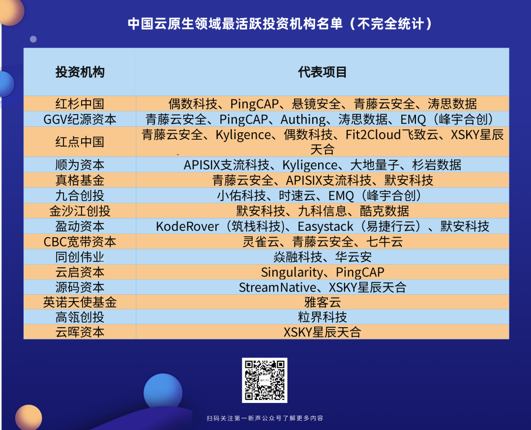 第一新声统计发现,云原生领域的诸多项目背后,都有着红杉中国、真格基金、九合创投、金沙江创投、源码资本等国内知名投资机构的身影。