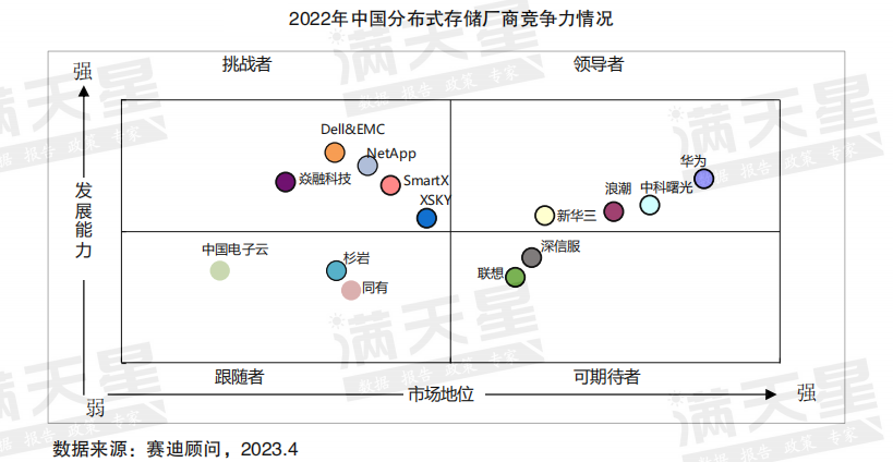 2022年中国分布式存储市场中,领导者有华为、中科曙光、浪潮、新华三;挑战者有XSKY、 SmartX、 NetApp、 Dell&EMC、焱融科技;跟随者有同有、杉岩和中国电子云;可期待者有深信服和联想。