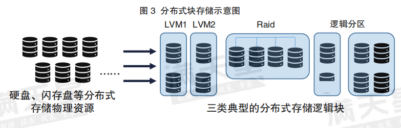 分布式块存储:指将各存储节点的硬盘、闪存盘等存储硬件资源通过划分逻辑卷(LVM)、创建独立冗余存储阵列(Raid)、逻辑分区等方式,由物理存储资源转化为面向需求的逻辑块,提高使用效率。