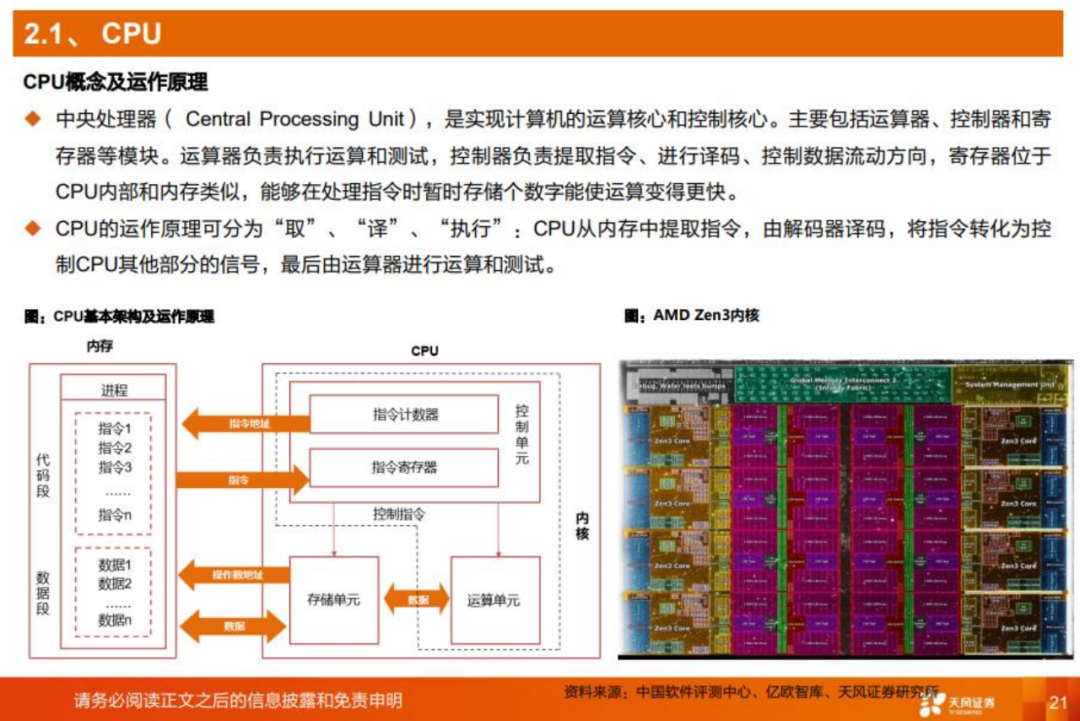 中央处理器(Central Processing Unit),是实现计算机的运算核心和控制核心。主要包括运算器、控制器和寄存器等模块。运算器负责执行运算和测试,控制器负责提取指令、进行译码、控制数据流动方向,寄存器位于CPU内部和内存类似,能够在处理指令时暂时存储个数字能使运算变得更快。CPU的运作原理可分为“取”、“译”、“执行”∶CPU从内存中提取指令,由解码器译码,将指令转化为控制CPU其他部分的信号,最后由运算器进行运算和测试。CPU指令集概念及分类