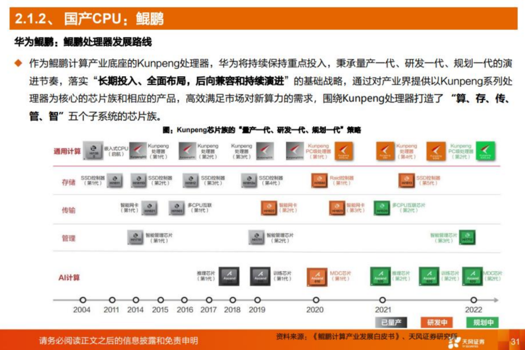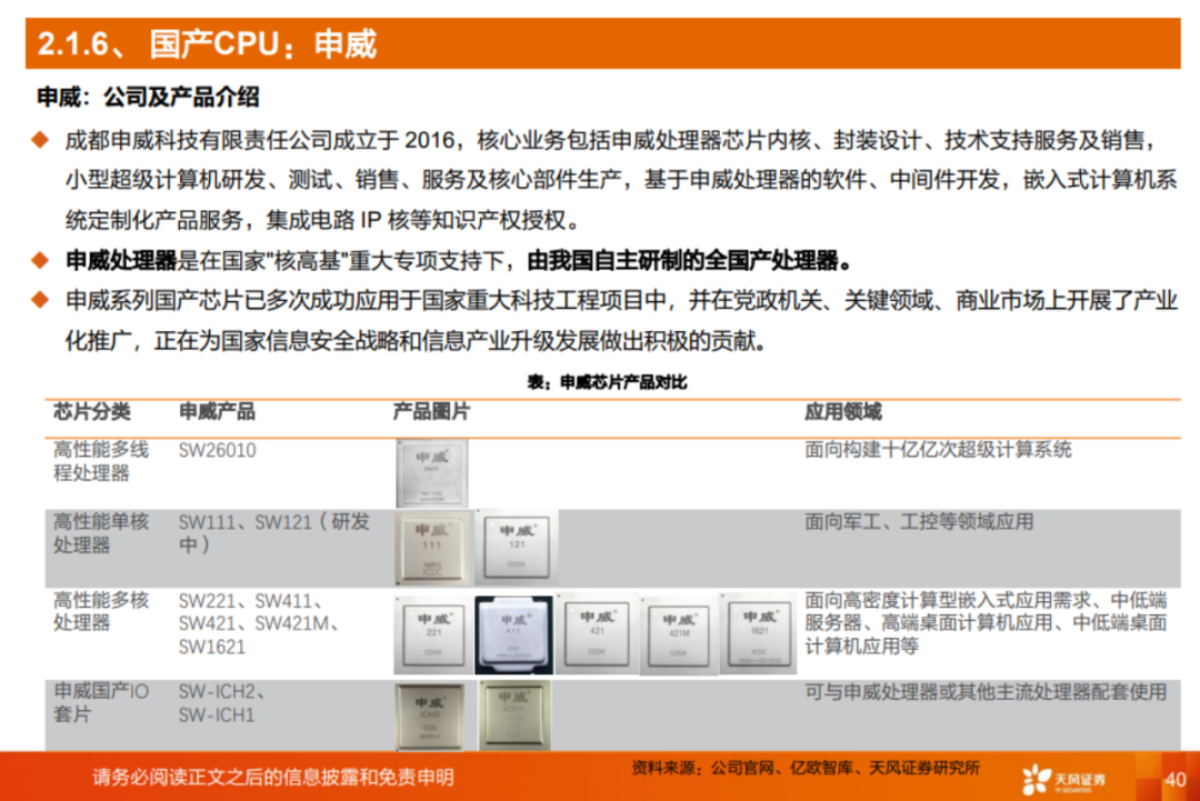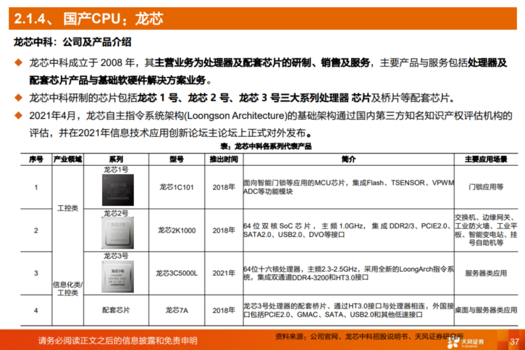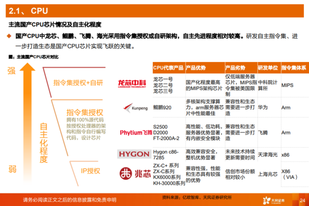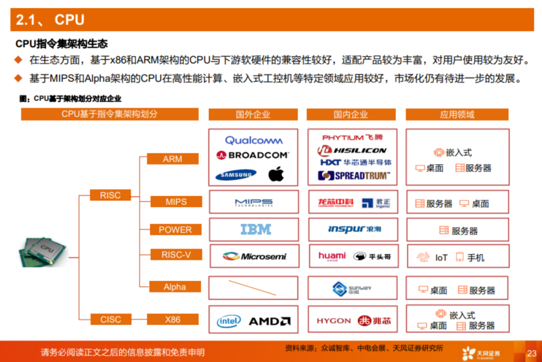在生态方面,基于x86和ARM架构的CPU与下游软硬件的兼容性较好,适配产品较为丰富,对用户使用较为友好。基于MIPS和Alpha架构的CPU在高性能计算、嵌入式工控机等特定领域应用较好,市场化仍有待进一步的发展。