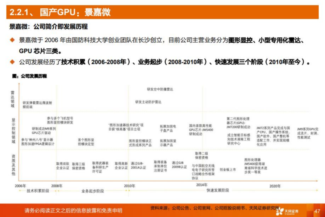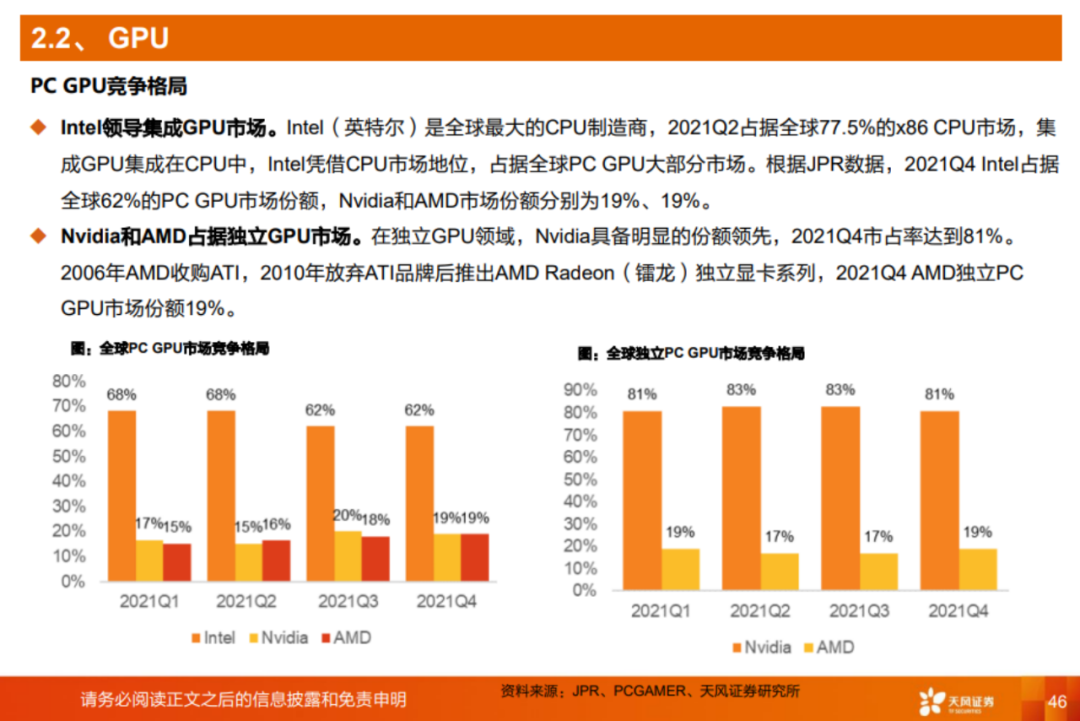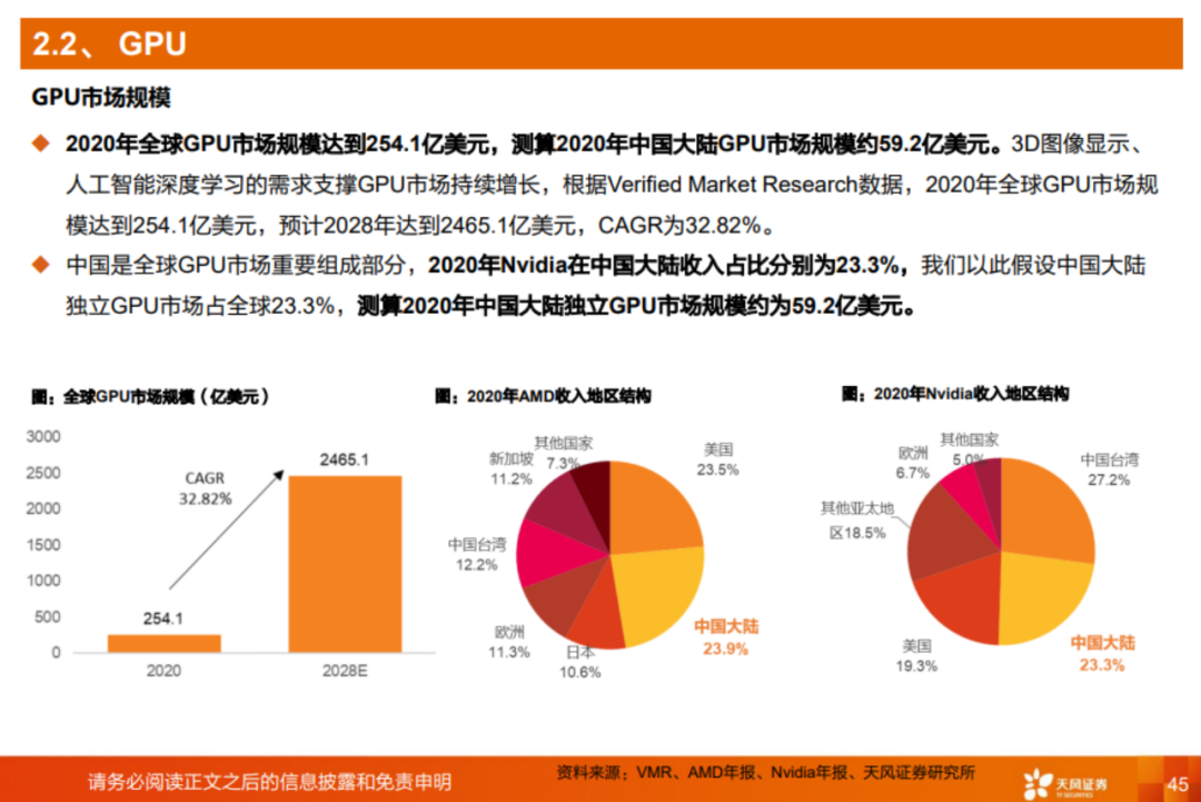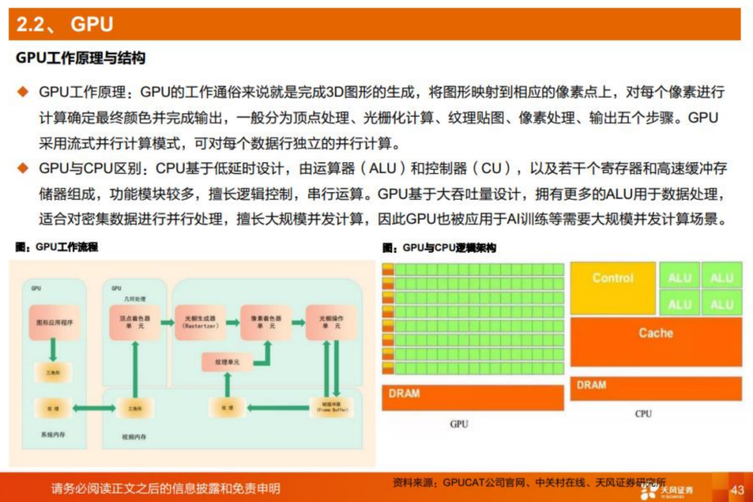 GPU工作原理∶GPU的工作通俗来说就是完成3D图形的生成,将图形映射到相应的像素点上,对每个像素进行计算确定最终颜色并完成输出,一般分为顶点处理、光栅化计算、纹理贴图、像素处理、输出五个步骤。GPU 采用流式并行计算模式,可对每个数据行独立的并行计算。GPU与CPU区别∶CPU基于低延时设计,由运算器(ALU)和控制器(CU),以及若干个寄存器和高速缓冲存储器组成,功能模块较多,擅长逻辑控制,串行运算。GPU基于大吞吐量设计,拥有更多的ALU用于数据处理,适合对密集数据进行并行处理,擅长大规模并发计算,因此GPU也被应用于Al训练等需要大规模并发计算场景。
