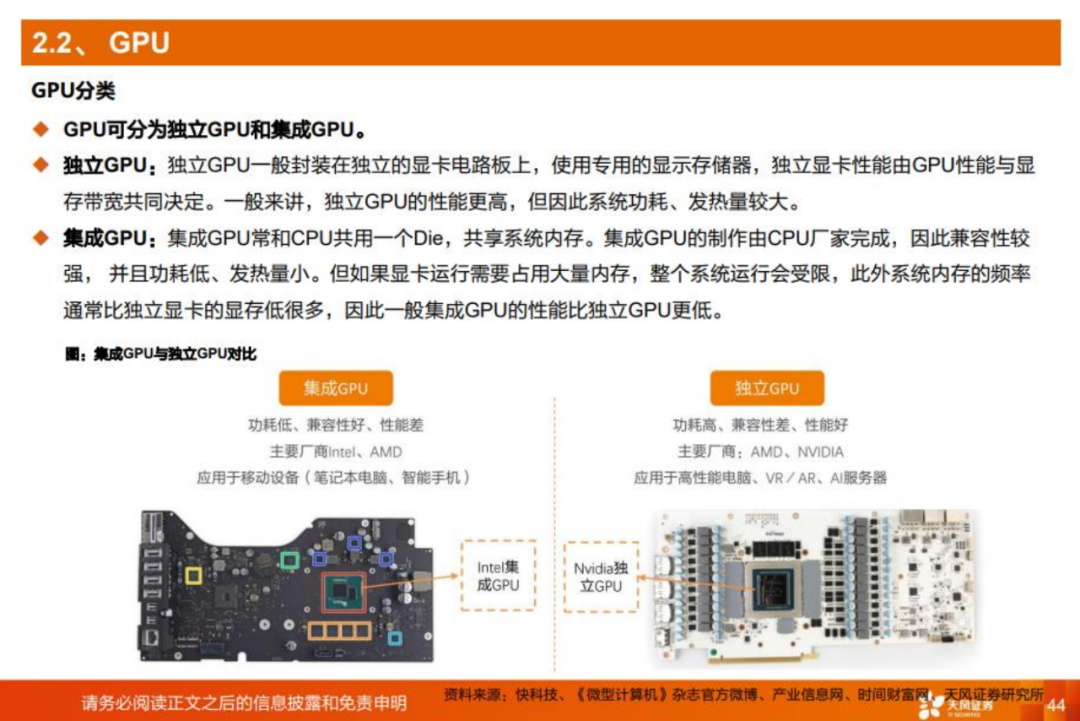 独立GPU独立GPU一般封装在独立的显卡电路板上,使用专用的显示存储器,独立显卡性能由GPU性能与显存带宽共同决定。一般来讲,独立GPU的性能更高,但因此系统功耗、发热量较大。集成GPU集成GPU常和CPU共用一个Die,共享系统内存。集成GPU的制作由CPU厂家完成,因此兼容性较强,并且功耗低、发热量小。但如果显卡运行需要占用大量内存,整个系统运行会受限,此外系统内存的频率通常比独立显卡的显存低很多,因此一般集成GPU的性能比独立GPU更低。存储存储概念及分类