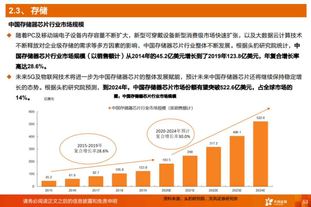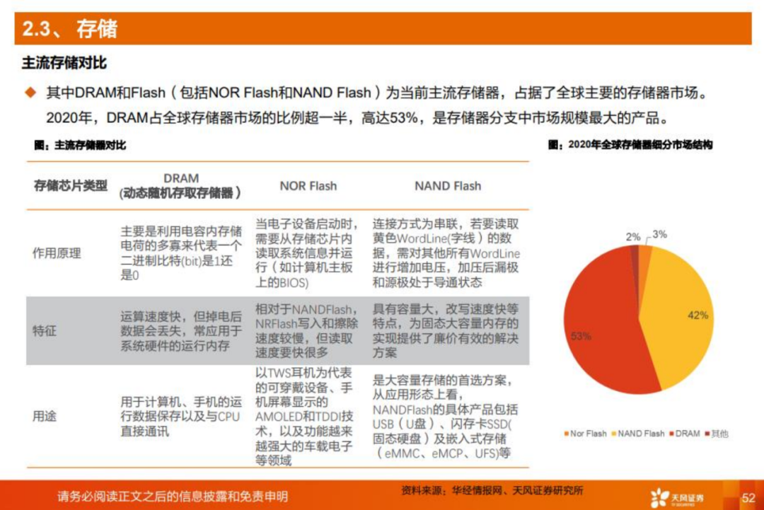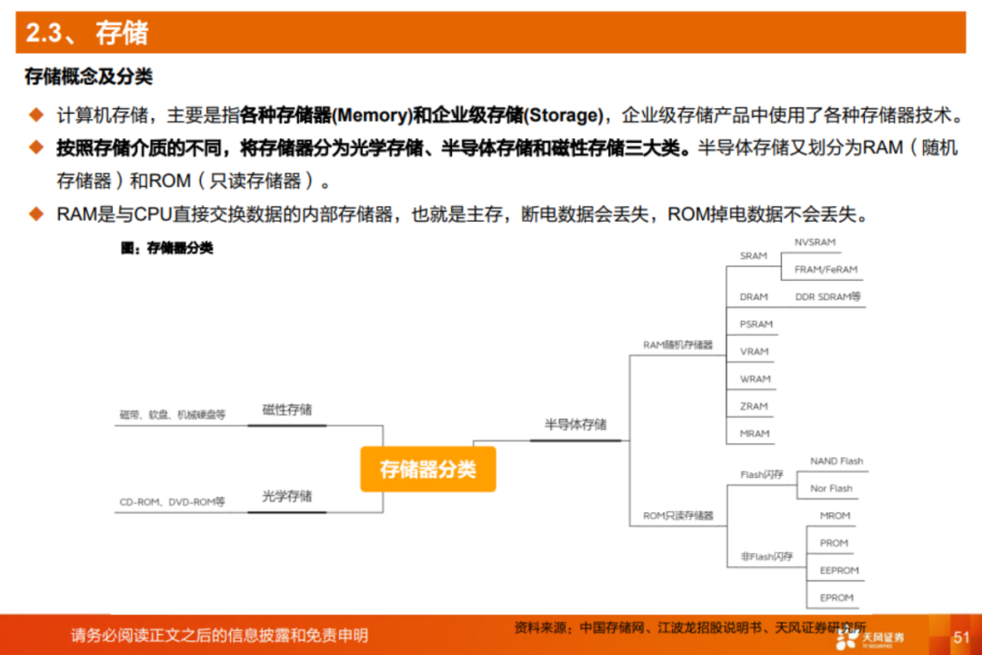 计算机存储,主要是指各种存储器(Memory)和企业级存储(Storage),企业级存储产品中使用了各种存储器技术。按照存储介质的不同,将存储器分为光学存储、半导体存储和磁性存储三大类。半导体存储又划分为RAM(随机存储器)和ROM(只读存储器)。RAM是与CPU直接交换数据的内部存储器,也就是主存,断电数据会丢失,ROM掉电数据不会丢失。其中DRAM和Flash(包括NOR Flash和NAND Flash)为当前主流存储器,占据了全球主要的存储器市场。2020年,DRAM占全球存储器市场的比例超一半,高达53%,是存储器分支中市场规模最大的产品。