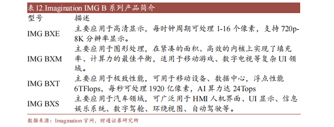 2020 年 10 月,Imagination 发布 IMG B 系列高性能 GPU IP。此款多核架构 GPUIP 包括 BXE、BXM、BXT、BXS 4 个系列, 分别代表入门级、中端、高端以及汽车安全。其中 BXT 主要应用于移动设备、数据中心,浮点算力 6TFlops,每秒可处理 1920 亿像素,AI 算力达 24Tops。