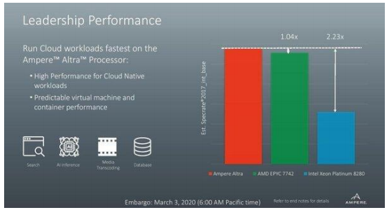 2020年3月,Ampere发布了Ampere Altra处理器,是首款80核的ARM服务器处理器,提供强大性能的同时拥有高能效。Ampere Altra处理器拥有80个核心,功耗为210 W,采用了台积电的7nm工艺,适用于数据分析、人工智能、数据库、存储、边缘计算、网络托管和云本地应用等用例。根据VentureBeat报道,Ampere认为该芯片比64核的AMD EPYC处理器和英特尔28核的高端Xeon“Cascade Lake”芯片速度更快。