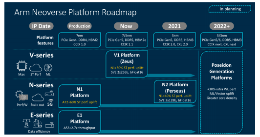 NeoverseV1和Neoverse N2全新推出,Neoverse性能指标再度升级。NeoverseV1作为V系列的第一个平台,与N1相比,其单线程性能可提升超过50%,为高性能云、高性能计算与机器学习等市场带来庞大的应用潜力。Neoverse N2被定位为可提供更高性能计算的解决方案,用来满足横向扩展的性能需求,相比于N1单线程性能提升了40%。