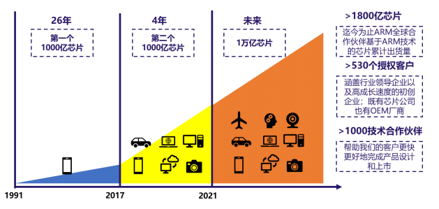 从移动端到PC端、服务器端再到汽车端、IoT端,ARM架构正在逐步走向一个庞大的生态系统。预计到2035年,将有超过1万亿台智能电子设备实现互联,从各种传感器、门禁卡、手机、家电、汽车,到工业机械、通信基站、数据中心、云服务器,基于Arm架构的芯片无处不在。