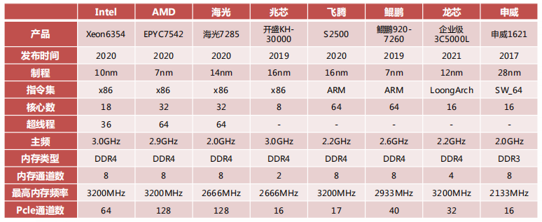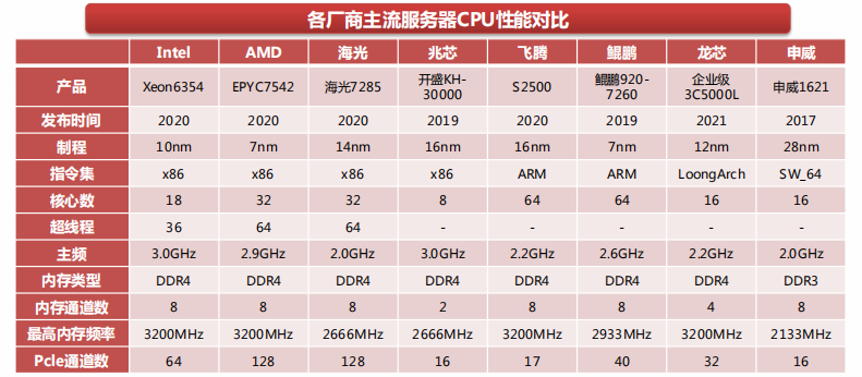 从性能角度看,海光7000系列、鲲鹏920分别是x86、ARM架构下的性能领先,飞腾在最新一代S2500发布后性能参数也跻身第一梯队;兆芯、龙芯、申威三家产品相对性能较弱,核心数仅为8/16核,内存通道、Pcle通道等参数也较弱,影响处理器I/O性能。