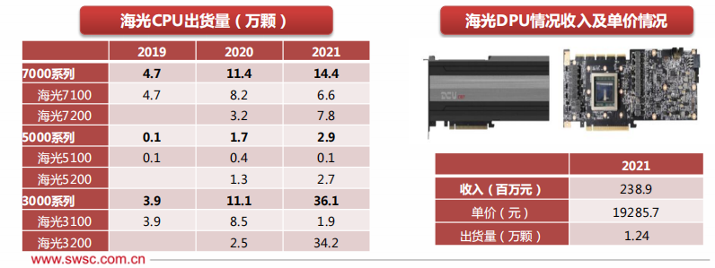 此外,海光于2021年实现DPU的规模化出货,当期即实现收入2.4亿元,表现亮眼。