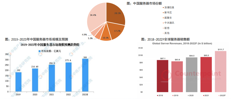服务器市场规模持续增长。根据 Counterpoint 的全球服务器销售跟踪报告,2022年,全球服务器出货量将同比增长6%,达到 1380 万台。收入将同比增长 17%,达到1117 亿美元。根据IDC、中商产业研究院,我国服务器市场规模由2019年的182亿美元增长至2022年的273.4亿美元,复合年均增长率达14.5%,预计2023年我国服务器市场规模将增至308亿美元。
