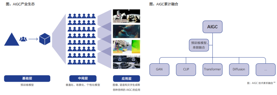 目前,AIGC产业生态体系的雏形已现,呈现为上中下三层架构:①第一层为上游基础层,也就是由预训练模型为基础搭建的AIGC技术基础设施层。②第二层为中间层,即垂直化、场景化、个性化的模型和应用工具。③第三层为应用层,即面向C端用户的文字、图片、音视频等内容生成服务。
