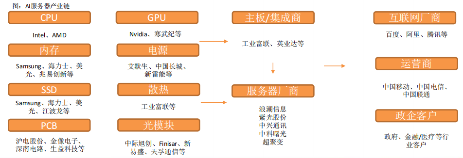 CPU主要供货厂商为Intel、GPU目前领先厂商为国际巨头英伟达,以及国内厂商如寒武纪、海光信息等。
