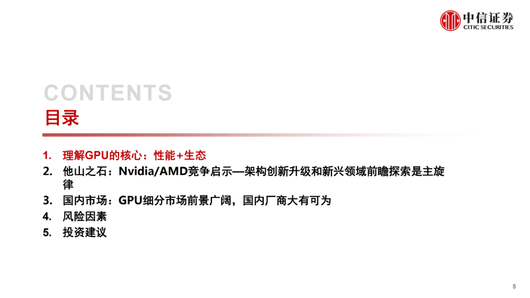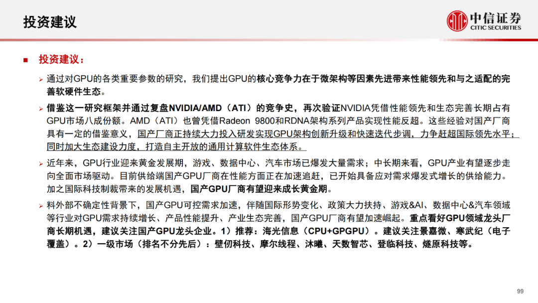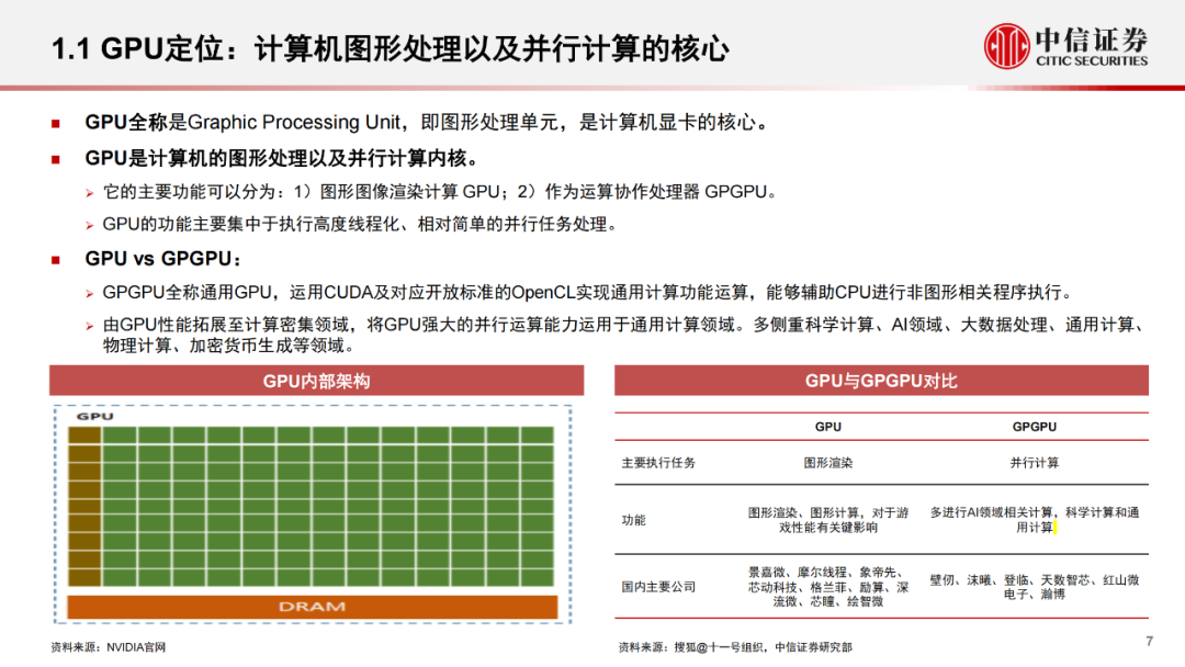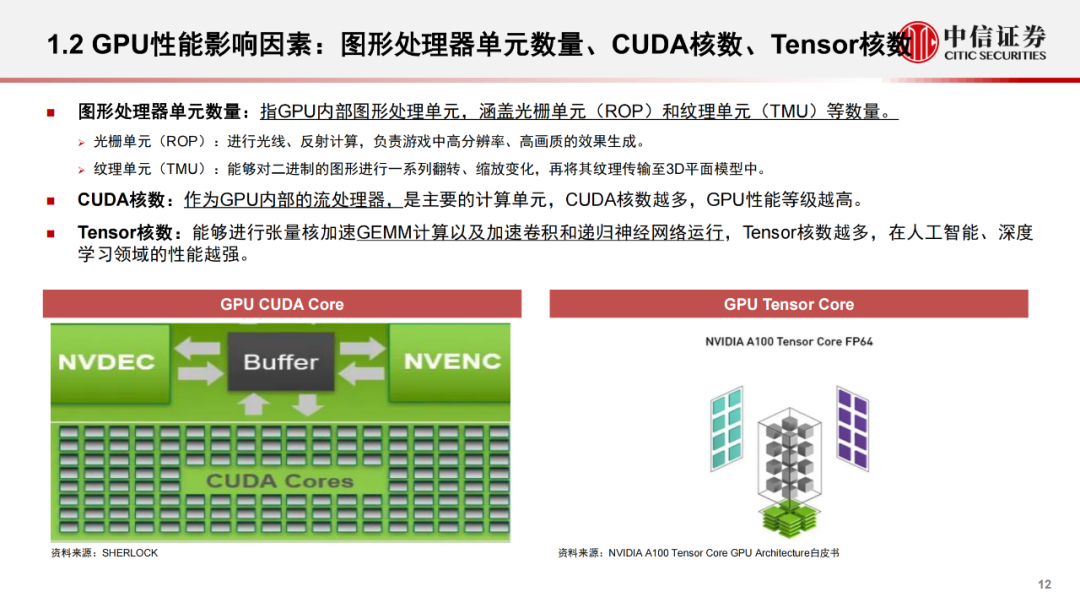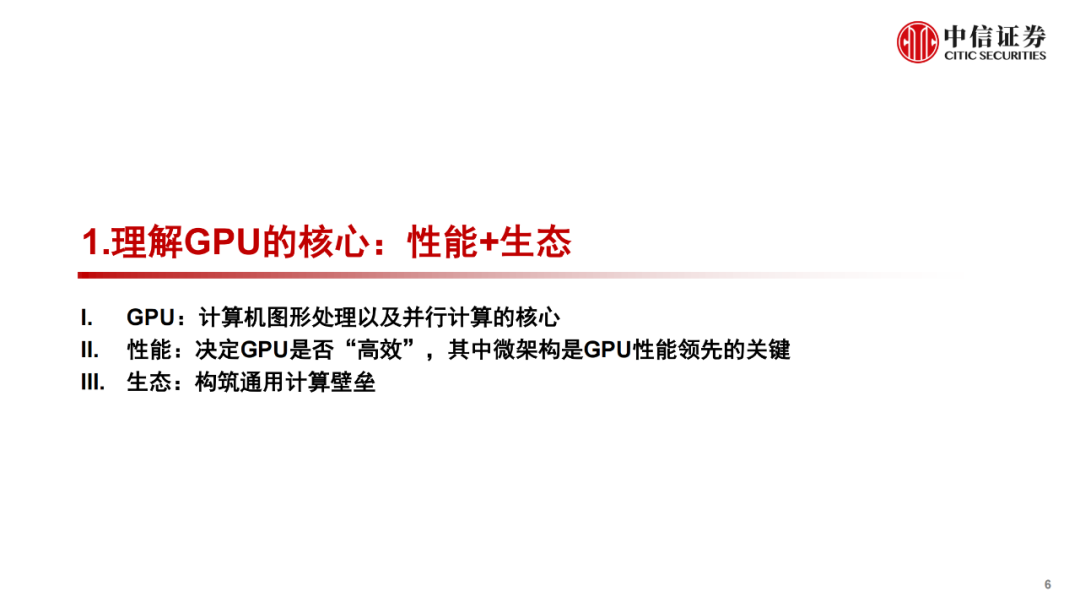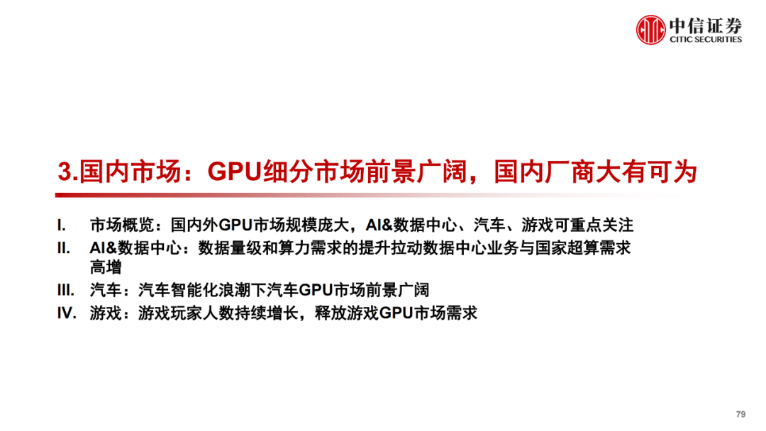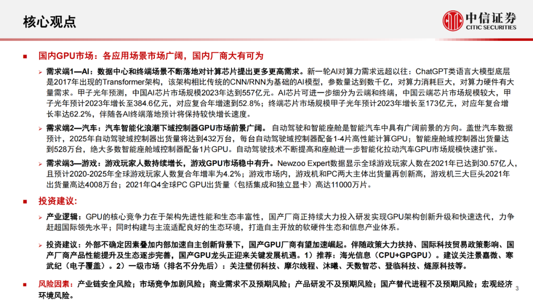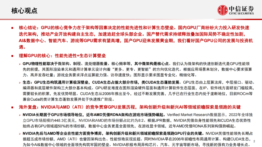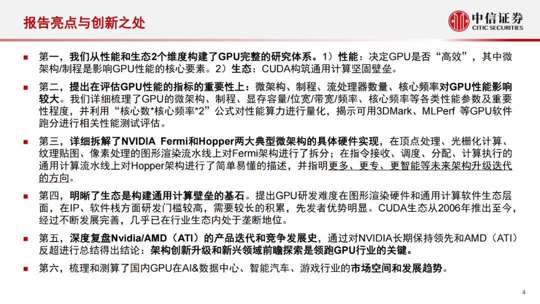 国内GPU厂商纷纷大力投入研发快速迭代架构,推动产业开放构建自主生态,加速追赶全球头部企业。国产替代需求持续释放叠加国际局势不确定性加剧,AI&数据中心、智能汽车、游戏等GPU需求有望高增,国产GPU迎来发展黄金期,我们看好国产GPU公司的发展与投资机遇。第一,我们从性能和生态2个维度构建了GPU完整的研究体系。1)性能:决定GPU是否“高效”,其中微架构/制程是影响GPU性能的核心要素。2)生态:CUDA构筑通用计算坚固壁垒。第二,提出在评估GPU性能的指标的重要性上:微架构、制程、流处理器数量、核心频率对GPU性能影响较大。我们详细梳理了GPU的微架构、制程、显存容量/位宽/带宽/频率、核心频率等各类性能参数及重要性程度,并利用“核心数*核心频率*2”公式对性能算力进行量化,揭示可用3DMark、MLPerf 等GPU软件跑分进行相关性能测试评估。第三,详细拆解了NVIDIA Fermi和Hopper两大典型微架构的具体硬件实现,在顶点处理、光栅化计算、纹理贴图、像素处理的图形渲染流水线上对Fermi架构进行了拆分;在指令接收、调度、分配、计算执行的通用计算流水线上对Hopper架构进行了简单易懂的描述,并指明更多、更专、更智能等未来架构升级迭代的方向。第四,明晰了生态是构建通用计算壁垒的基石。提出GPU研发难度在图形渲染硬件和通用计算软件生态层面,在IP、软件栈方面研发门槛较高,需要较长的积累,先发者优势明显。CUDA生态从2006年推出至今,经过不断发展完善,几乎已在行业生态内处于垄断地位。第五,深度复盘Nvidia/AMD(ATI)的产品迭代和竞争发展史,通过对NVIDIA长期保持领先和AMD(ATI)反超进行总结得出结论:架构创新升级和新兴领域前瞻探索是领跑GPU行业的关键。 第六,梳理和测算了国内GPU在AI&数据中心、智能汽车、游戏行业的市场空间和发展趋势。