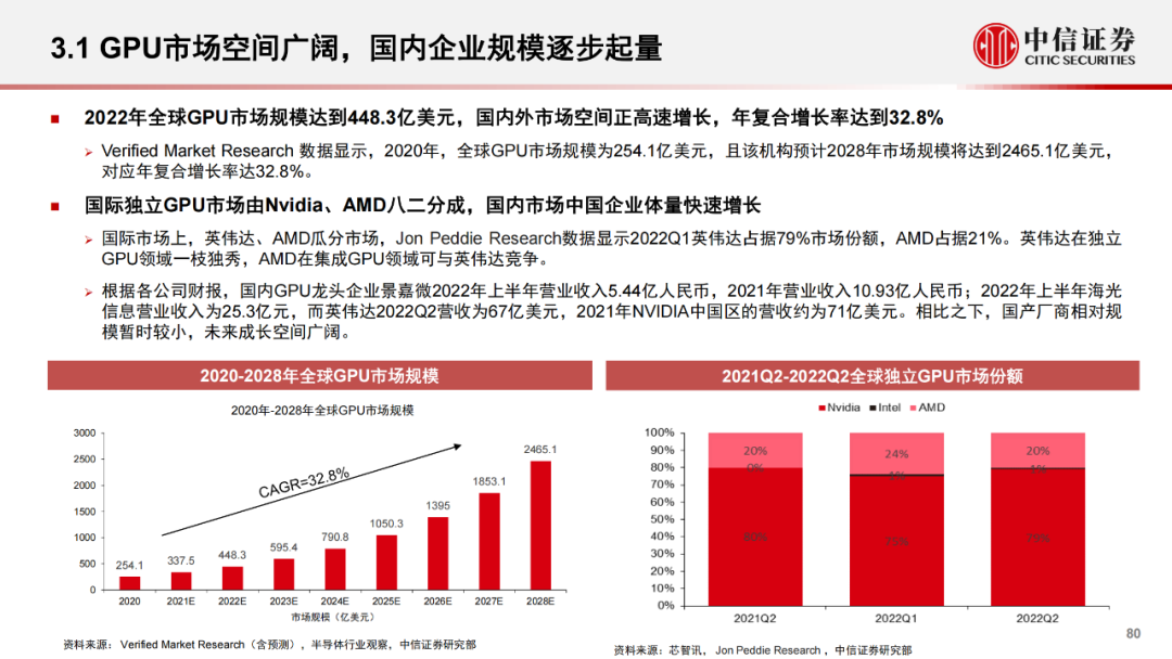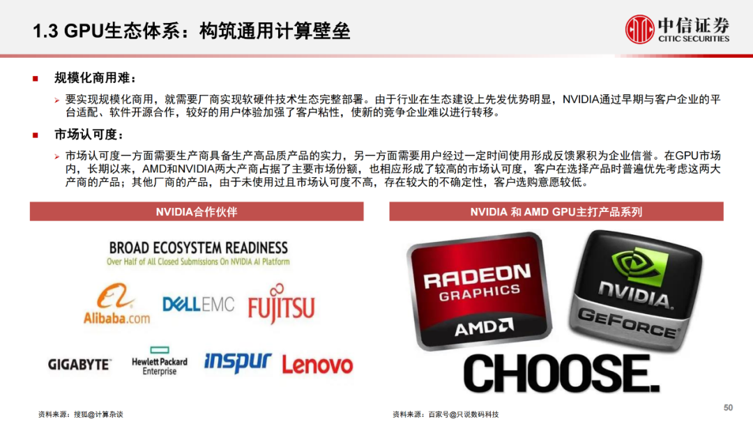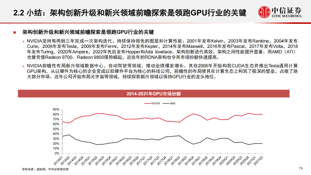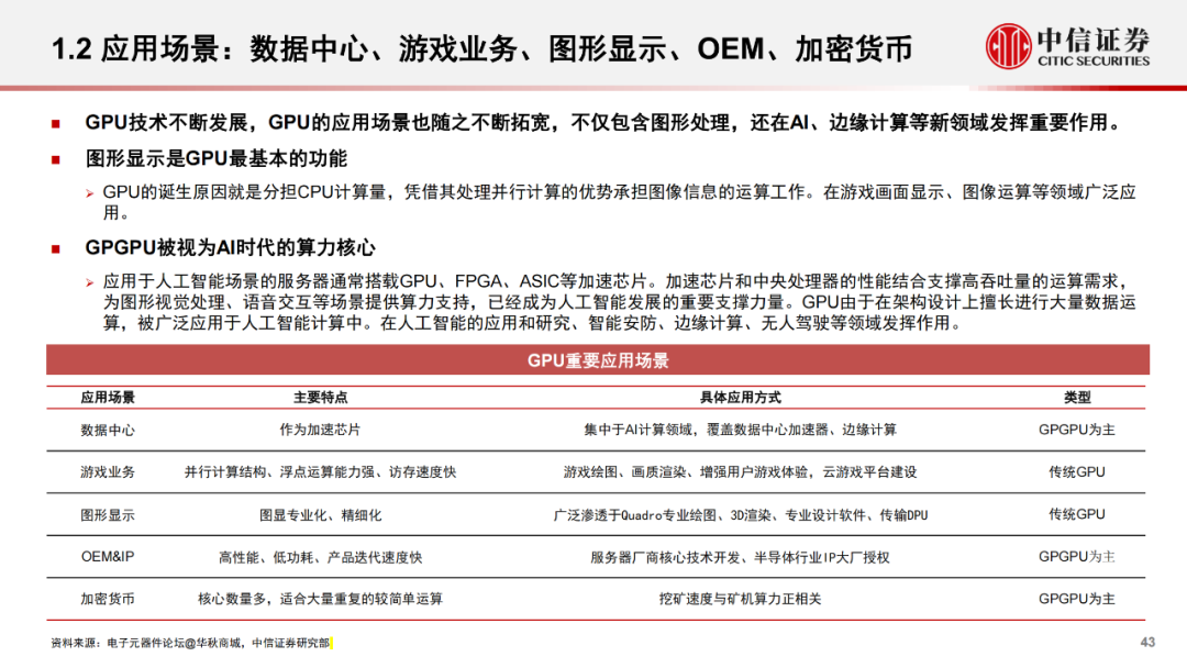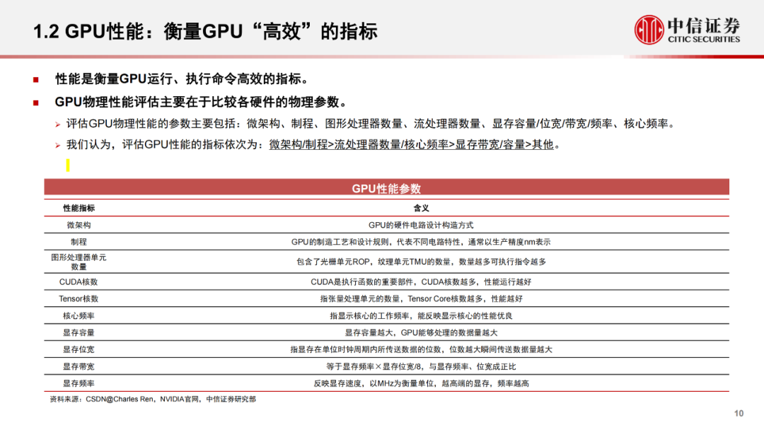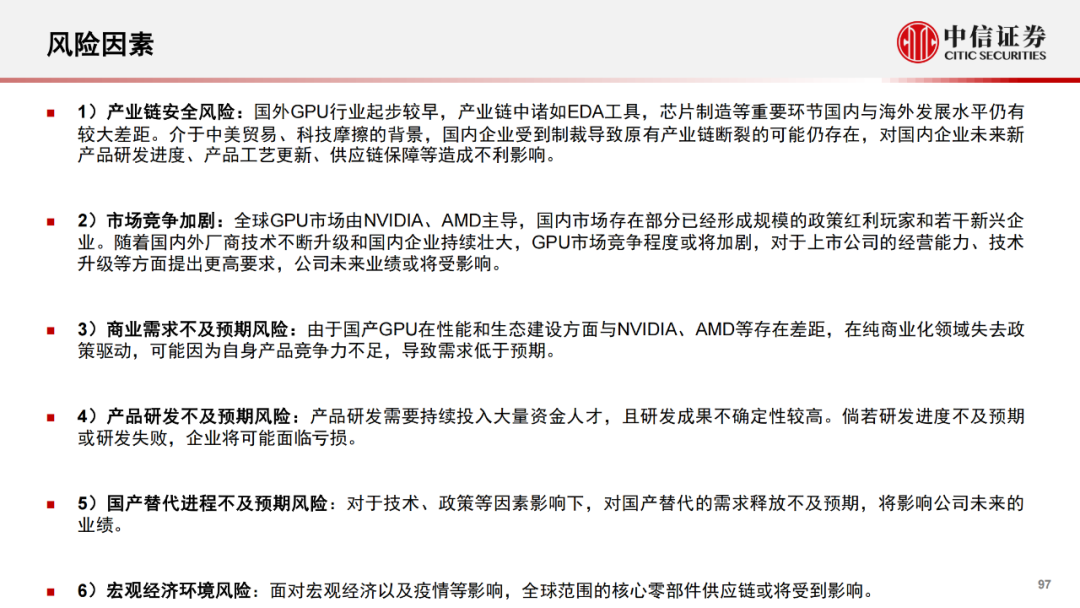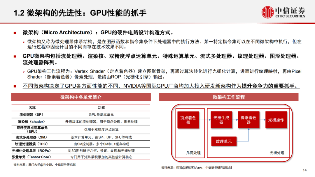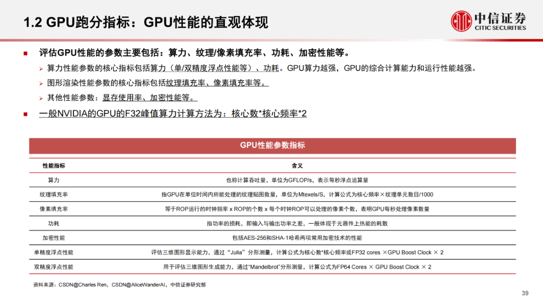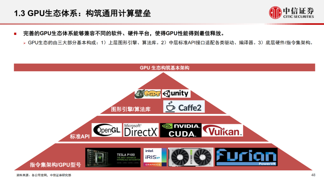 国内GPU厂商纷纷大力投入研发快速迭代架构,推动产业开放构建自主生态,加速追赶全球头部企业。国产替代需求持续释放叠加国际局势不确定性加剧,AI&数据中心、智能汽车、游戏等GPU需求有望高增,国产GPU迎来发展黄金期,我们看好国产GPU公司的发展与投资机遇。第一,我们从性能和生态2个维度构建了GPU完整的研究体系。1)性能:决定GPU是否“高效”,其中微架构/制程是影响GPU性能的核心要素。2)生态:CUDA构筑通用计算坚固壁垒。第二,提出在评估GPU性能的指标的重要性上:微架构、制程、流处理器数量、核心频率对GPU性能影响较大。我们详细梳理了GPU的微架构、制程、显存容量/位宽/带宽/频率、核心频率等各类性能参数及重要性程度,并利用“核心数*核心频率*2”公式对性能算力进行量化,揭示可用3DMark、MLPerf 等GPU软件跑分进行相关性能测试评估。第三,详细拆解了NVIDIA Fermi和Hopper两大典型微架构的具体硬件实现,在顶点处理、光栅化计算、纹理贴图、像素处理的图形渲染流水线上对Fermi架构进行了拆分;在指令接收、调度、分配、计算执行的通用计算流水线上对Hopper架构进行了简单易懂的描述,并指明更多、更专、更智能等未来架构升级迭代的方向。第四,明晰了生态是构建通用计算壁垒的基石。提出GPU研发难度在图形渲染硬件和通用计算软件生态层面,在IP、软件栈方面研发门槛较高,需要较长的积累,先发者优势明显。CUDA生态从2006年推出至今,经过不断发展完善,几乎已在行业生态内处于垄断地位。第五,深度复盘Nvidia/AMD(ATI)的产品迭代和竞争发展史,通过对NVIDIA长期保持领先和AMD(ATI)反超进行总结得出结论:架构创新升级和新兴领域前瞻探索是领跑GPU行业的关键。 第六,梳理和测算了国内GPU在AI&数据中心、智能汽车、游戏行业的市场空间和发展趋势。