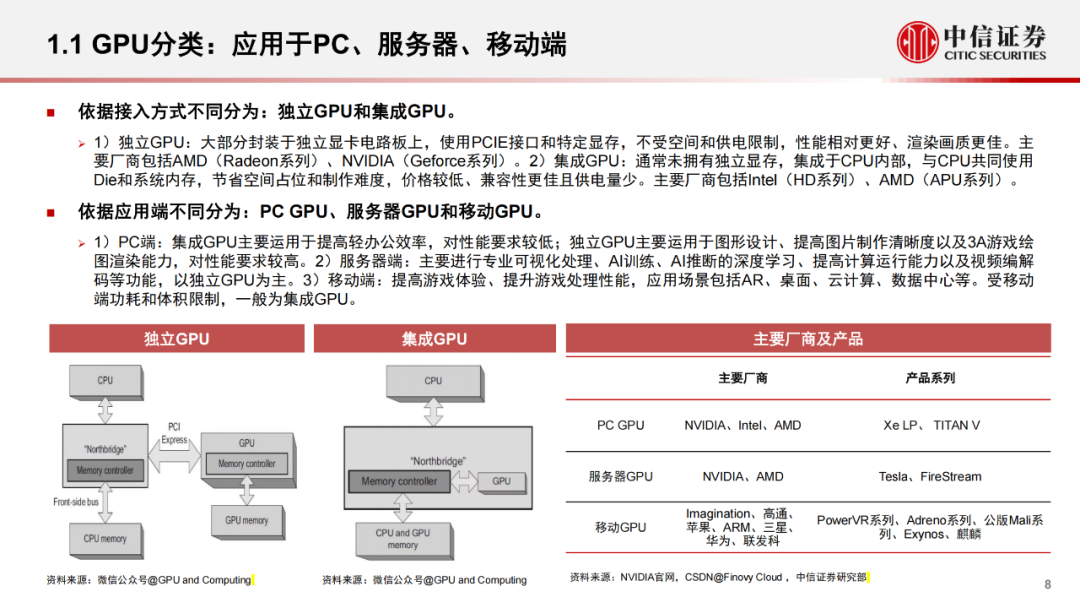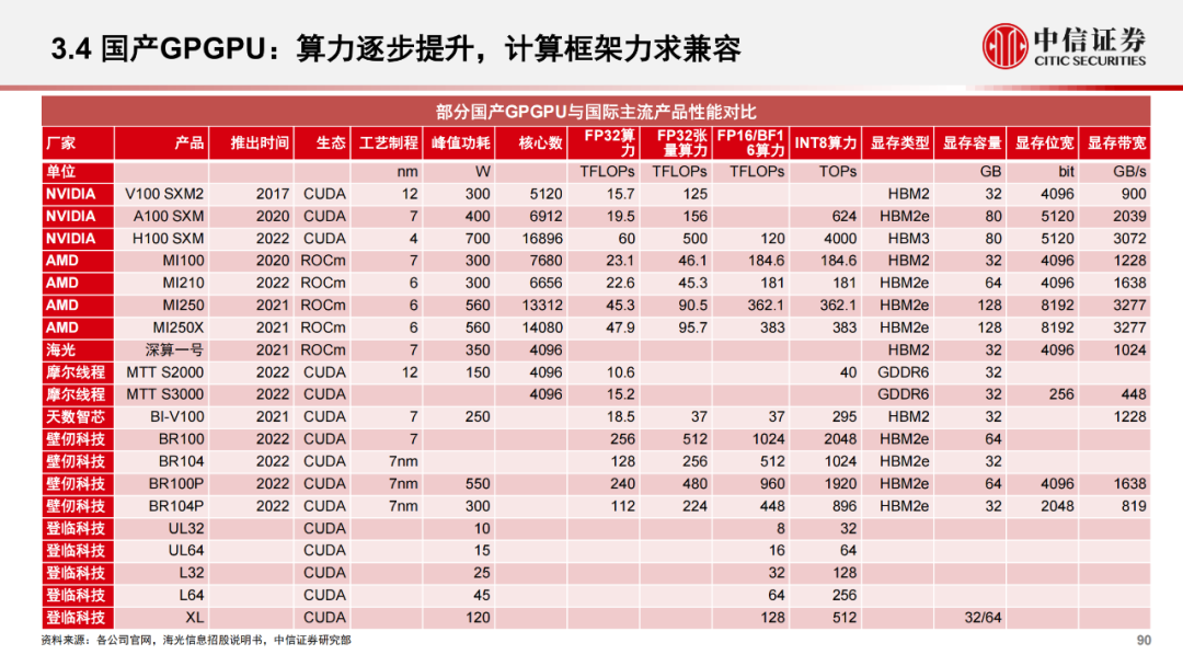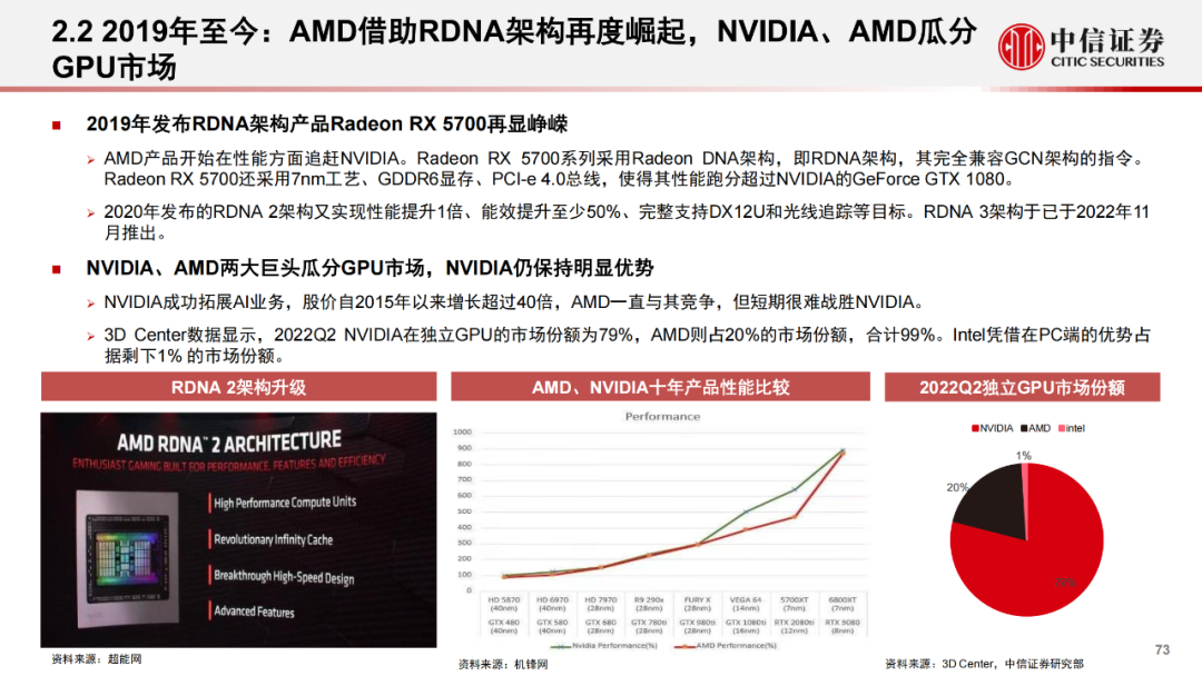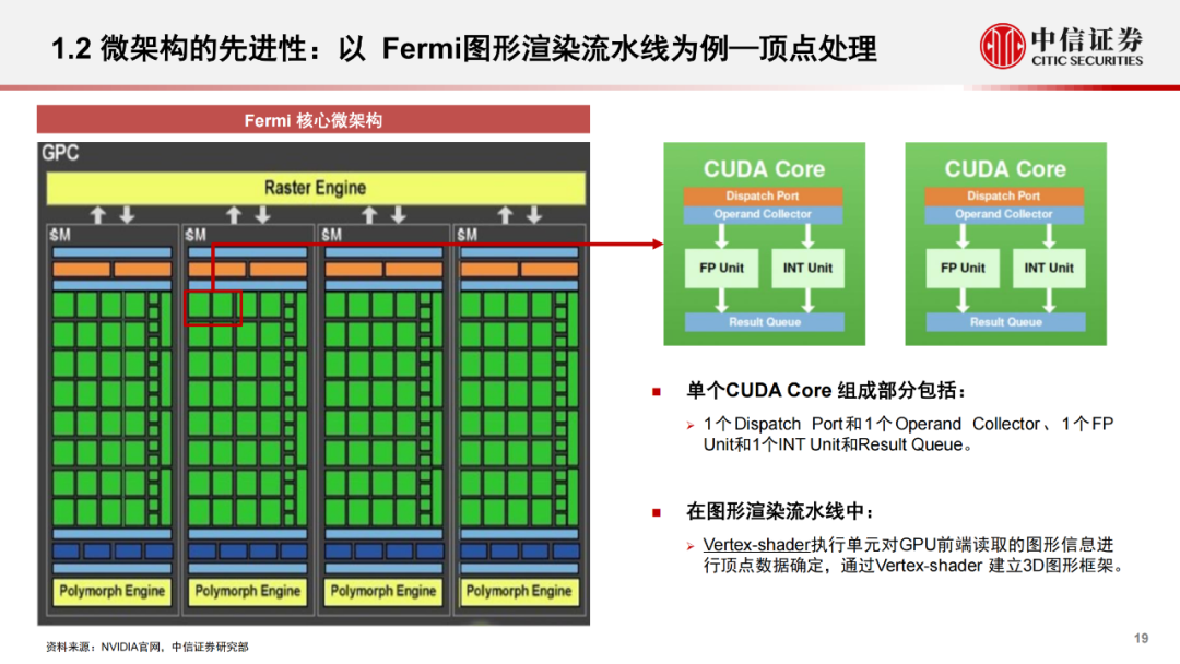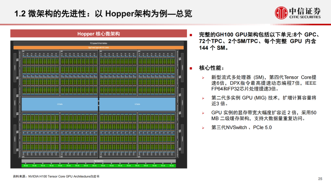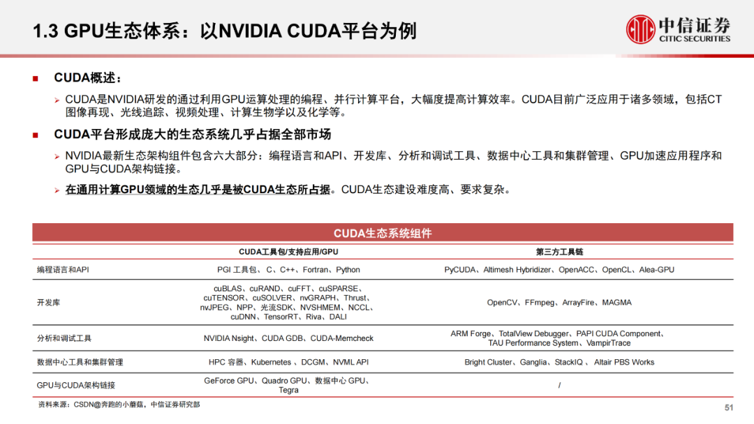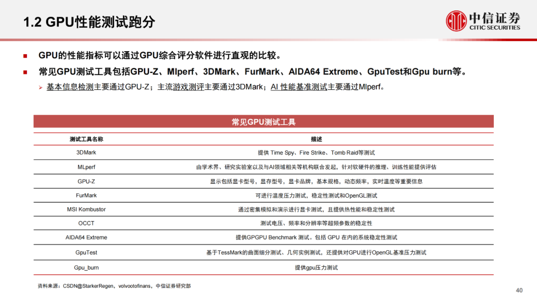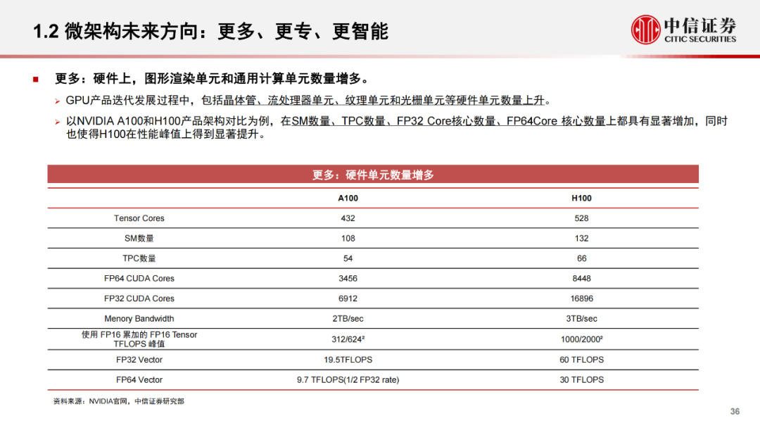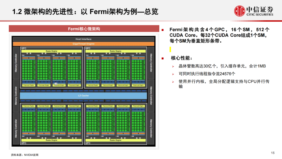 国内GPU厂商纷纷大力投入研发快速迭代架构,推动产业开放构建自主生态,加速追赶全球头部企业。国产替代需求持续释放叠加国际局势不确定性加剧,AI&数据中心、智能汽车、游戏等GPU需求有望高增,国产GPU迎来发展黄金期,我们看好国产GPU公司的发展与投资机遇。第一,我们从性能和生态2个维度构建了GPU完整的研究体系。1)性能:决定GPU是否“高效”,其中微架构/制程是影响GPU性能的核心要素。2)生态:CUDA构筑通用计算坚固壁垒。第二,提出在评估GPU性能的指标的重要性上:微架构、制程、流处理器数量、核心频率对GPU性能影响较大。我们详细梳理了GPU的微架构、制程、显存容量/位宽/带宽/频率、核心频率等各类性能参数及重要性程度,并利用“核心数*核心频率*2”公式对性能算力进行量化,揭示可用3DMark、MLPerf 等GPU软件跑分进行相关性能测试评估。第三,详细拆解了NVIDIA Fermi和Hopper两大典型微架构的具体硬件实现,在顶点处理、光栅化计算、纹理贴图、像素处理的图形渲染流水线上对Fermi架构进行了拆分;在指令接收、调度、分配、计算执行的通用计算流水线上对Hopper架构进行了简单易懂的描述,并指明更多、更专、更智能等未来架构升级迭代的方向。第四,明晰了生态是构建通用计算壁垒的基石。提出GPU研发难度在图形渲染硬件和通用计算软件生态层面,在IP、软件栈方面研发门槛较高,需要较长的积累,先发者优势明显。CUDA生态从2006年推出至今,经过不断发展完善,几乎已在行业生态内处于垄断地位。第五,深度复盘Nvidia/AMD(ATI)的产品迭代和竞争发展史,通过对NVIDIA长期保持领先和AMD(ATI)反超进行总结得出结论:架构创新升级和新兴领域前瞻探索是领跑GPU行业的关键。 第六,梳理和测算了国内GPU在AI&数据中心、智能汽车、游戏行业的市场空间和发展趋势。