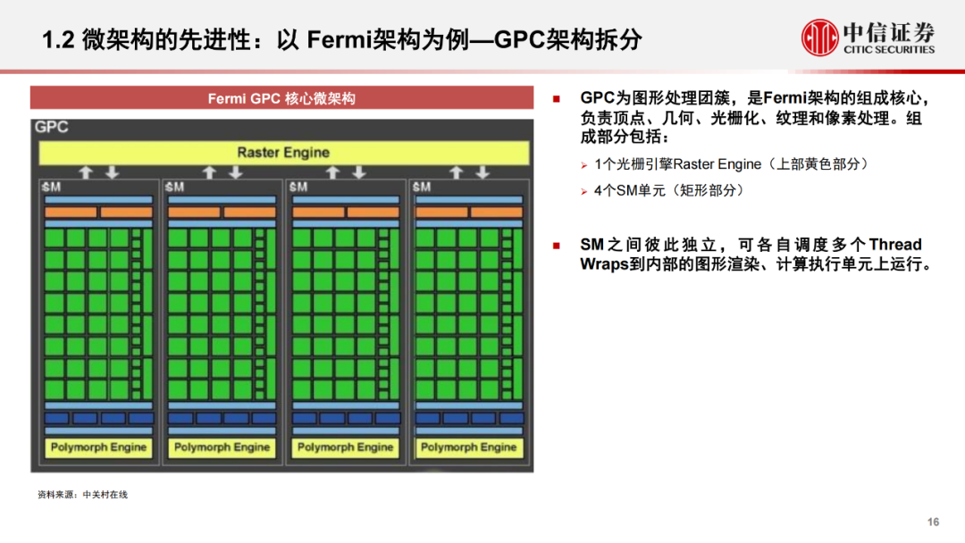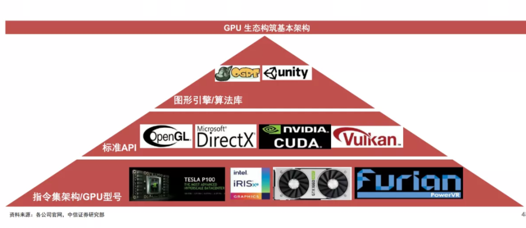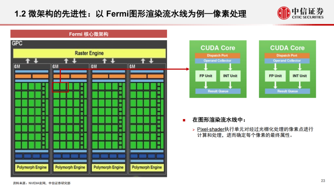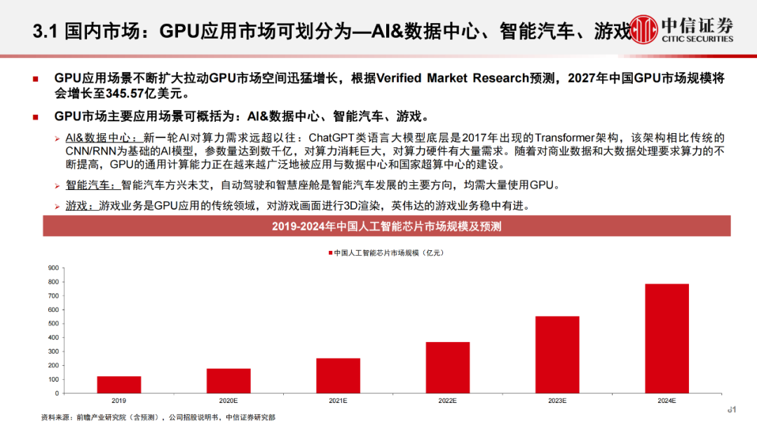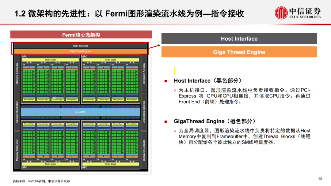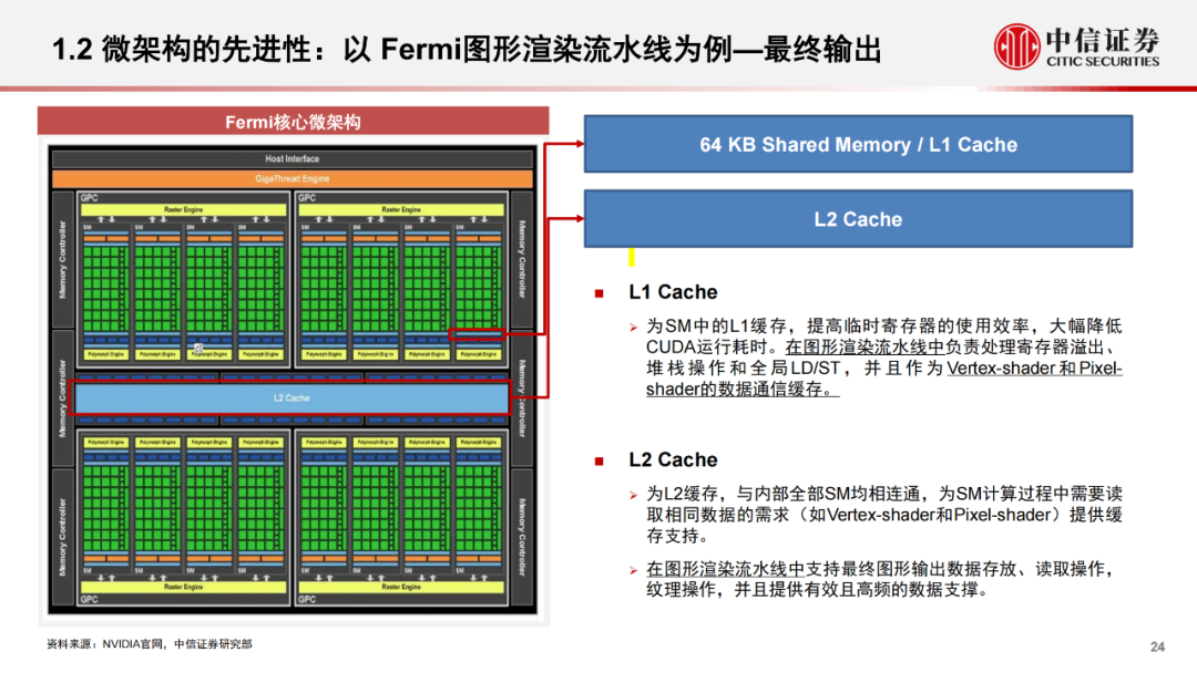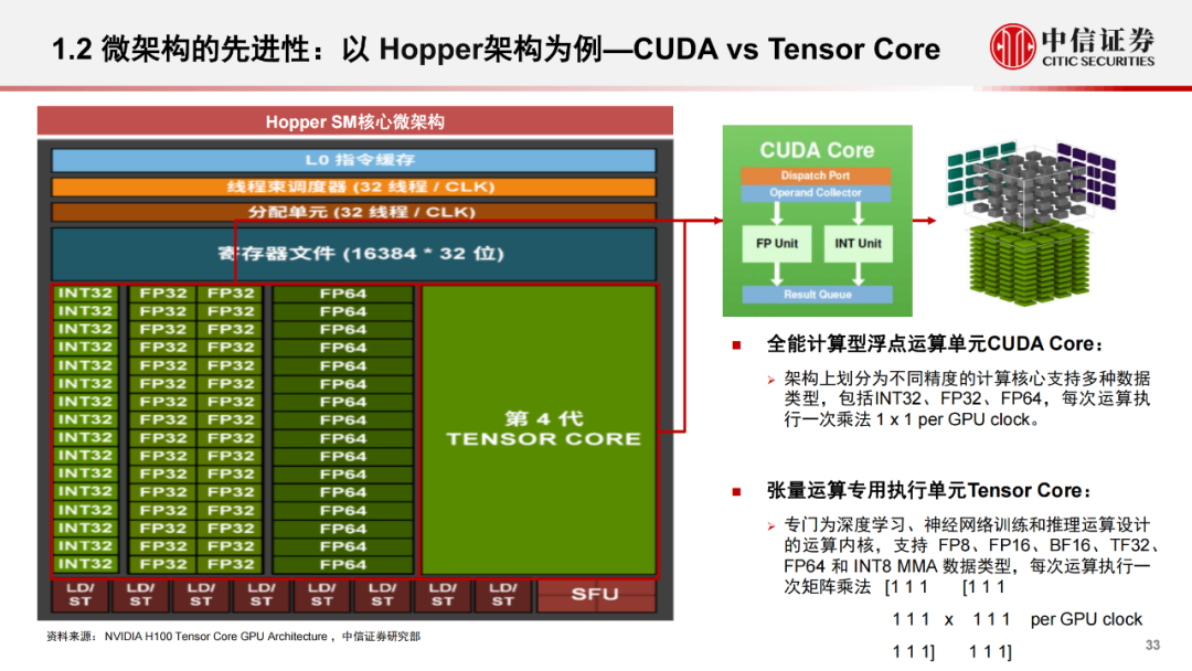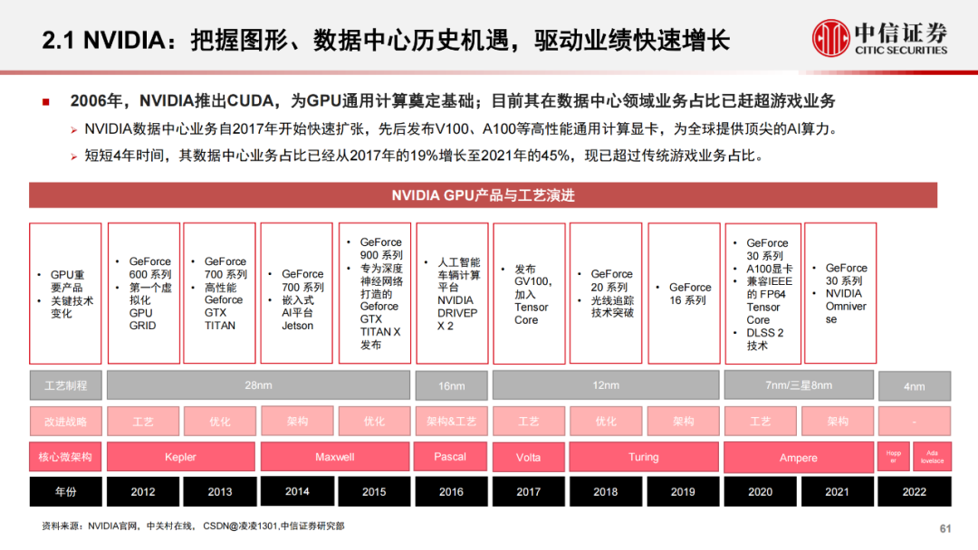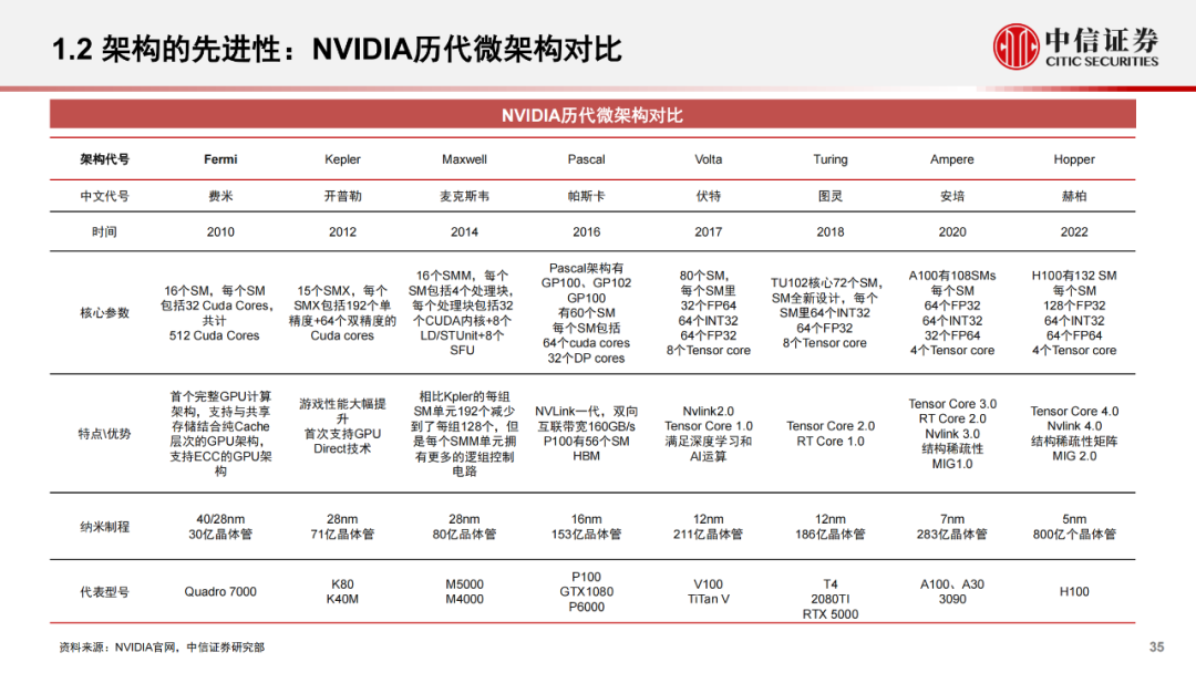 国内GPU厂商纷纷大力投入研发快速迭代架构,推动产业开放构建自主生态,加速追赶全球头部企业。国产替代需求持续释放叠加国际局势不确定性加剧,AI&数据中心、智能汽车、游戏等GPU需求有望高增,国产GPU迎来发展黄金期,我们看好国产GPU公司的发展与投资机遇。第一,我们从性能和生态2个维度构建了GPU完整的研究体系。1)性能:决定GPU是否“高效”,其中微架构/制程是影响GPU性能的核心要素。2)生态:CUDA构筑通用计算坚固壁垒。第二,提出在评估GPU性能的指标的重要性上:微架构、制程、流处理器数量、核心频率对GPU性能影响较大。我们详细梳理了GPU的微架构、制程、显存容量/位宽/带宽/频率、核心频率等各类性能参数及重要性程度,并利用“核心数*核心频率*2”公式对性能算力进行量化,揭示可用3DMark、MLPerf 等GPU软件跑分进行相关性能测试评估。第三,详细拆解了NVIDIA Fermi和Hopper两大典型微架构的具体硬件实现,在顶点处理、光栅化计算、纹理贴图、像素处理的图形渲染流水线上对Fermi架构进行了拆分;在指令接收、调度、分配、计算执行的通用计算流水线上对Hopper架构进行了简单易懂的描述,并指明更多、更专、更智能等未来架构升级迭代的方向。第四,明晰了生态是构建通用计算壁垒的基石。提出GPU研发难度在图形渲染硬件和通用计算软件生态层面,在IP、软件栈方面研发门槛较高,需要较长的积累,先发者优势明显。CUDA生态从2006年推出至今,经过不断发展完善,几乎已在行业生态内处于垄断地位。第五,深度复盘Nvidia/AMD(ATI)的产品迭代和竞争发展史,通过对NVIDIA长期保持领先和AMD(ATI)反超进行总结得出结论:架构创新升级和新兴领域前瞻探索是领跑GPU行业的关键。 第六,梳理和测算了国内GPU在AI&数据中心、智能汽车、游戏行业的市场空间和发展趋势。