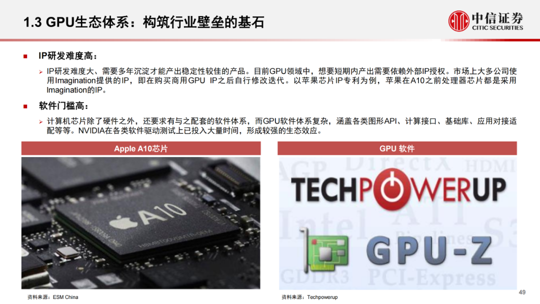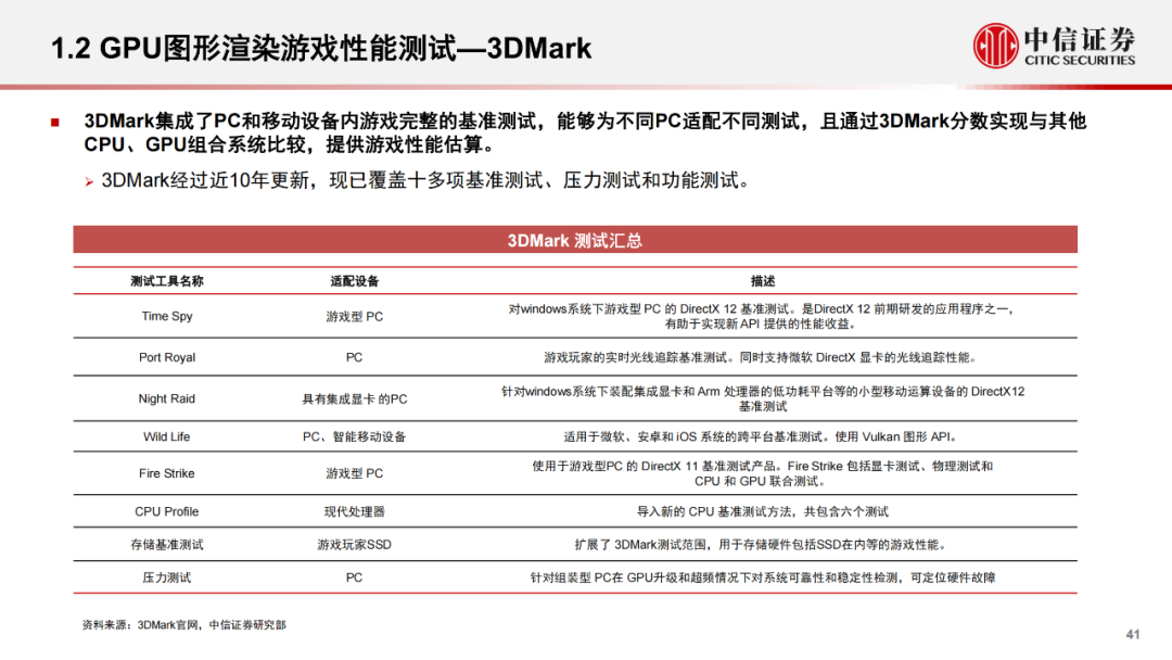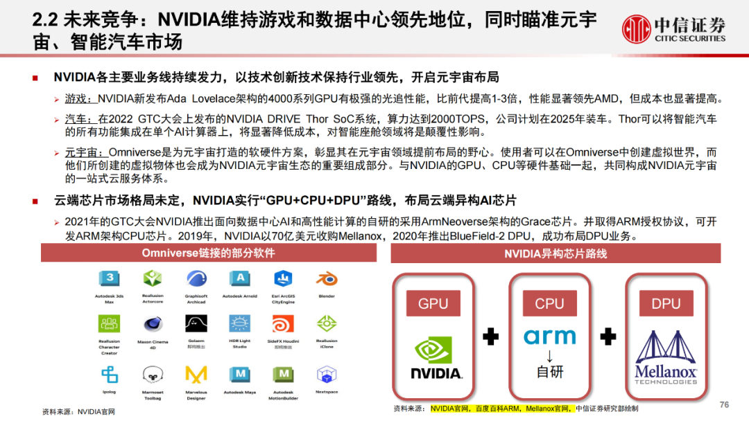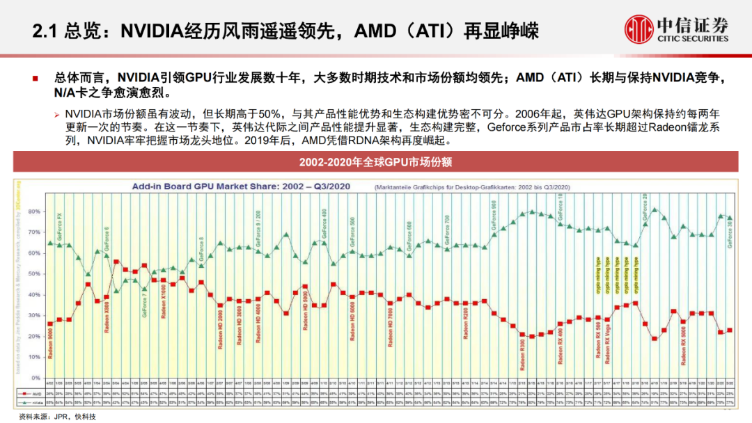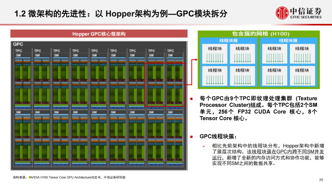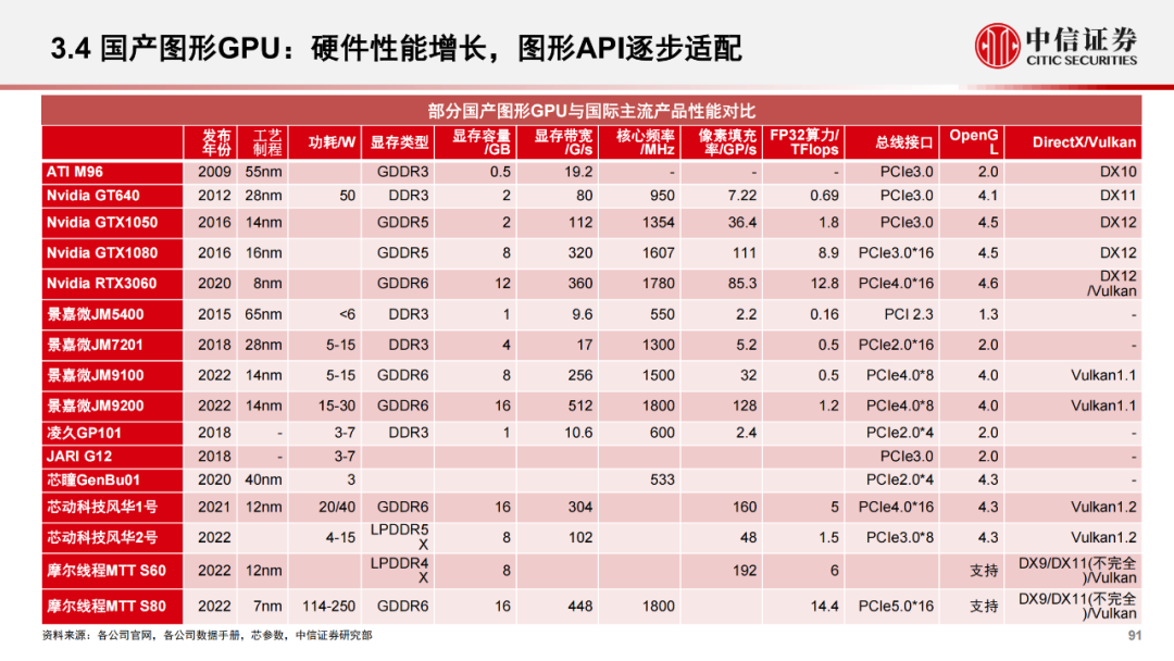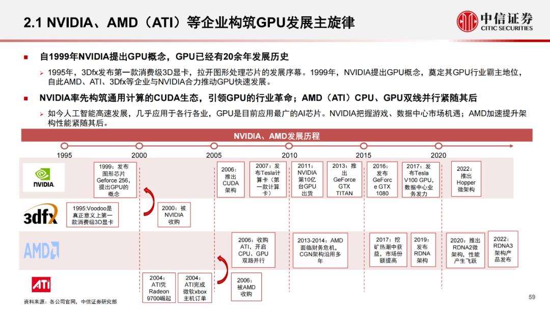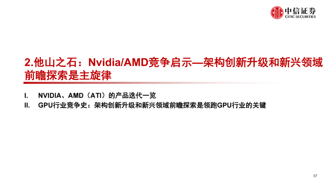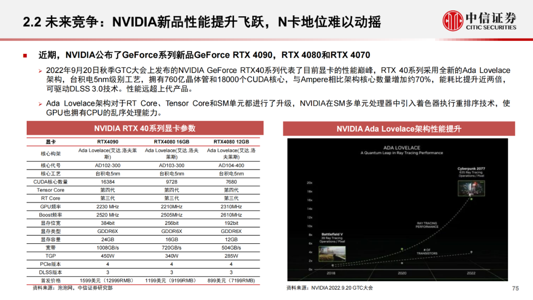 国内GPU厂商纷纷大力投入研发快速迭代架构,推动产业开放构建自主生态,加速追赶全球头部企业。国产替代需求持续释放叠加国际局势不确定性加剧,AI&数据中心、智能汽车、游戏等GPU需求有望高增,国产GPU迎来发展黄金期,我们看好国产GPU公司的发展与投资机遇。第一,我们从性能和生态2个维度构建了GPU完整的研究体系。1)性能:决定GPU是否“高效”,其中微架构/制程是影响GPU性能的核心要素。2)生态:CUDA构筑通用计算坚固壁垒。第二,提出在评估GPU性能的指标的重要性上:微架构、制程、流处理器数量、核心频率对GPU性能影响较大。我们详细梳理了GPU的微架构、制程、显存容量/位宽/带宽/频率、核心频率等各类性能参数及重要性程度,并利用“核心数*核心频率*2”公式对性能算力进行量化,揭示可用3DMark、MLPerf 等GPU软件跑分进行相关性能测试评估。第三,详细拆解了NVIDIA Fermi和Hopper两大典型微架构的具体硬件实现,在顶点处理、光栅化计算、纹理贴图、像素处理的图形渲染流水线上对Fermi架构进行了拆分;在指令接收、调度、分配、计算执行的通用计算流水线上对Hopper架构进行了简单易懂的描述,并指明更多、更专、更智能等未来架构升级迭代的方向。第四,明晰了生态是构建通用计算壁垒的基石。提出GPU研发难度在图形渲染硬件和通用计算软件生态层面,在IP、软件栈方面研发门槛较高,需要较长的积累,先发者优势明显。CUDA生态从2006年推出至今,经过不断发展完善,几乎已在行业生态内处于垄断地位。第五,深度复盘Nvidia/AMD(ATI)的产品迭代和竞争发展史,通过对NVIDIA长期保持领先和AMD(ATI)反超进行总结得出结论:架构创新升级和新兴领域前瞻探索是领跑GPU行业的关键。 第六,梳理和测算了国内GPU在AI&数据中心、智能汽车、游戏行业的市场空间和发展趋势。
