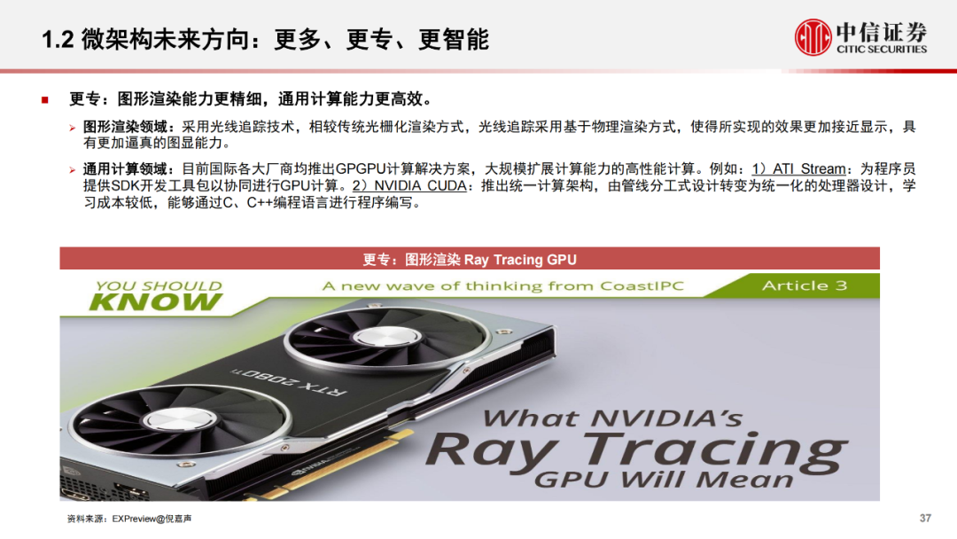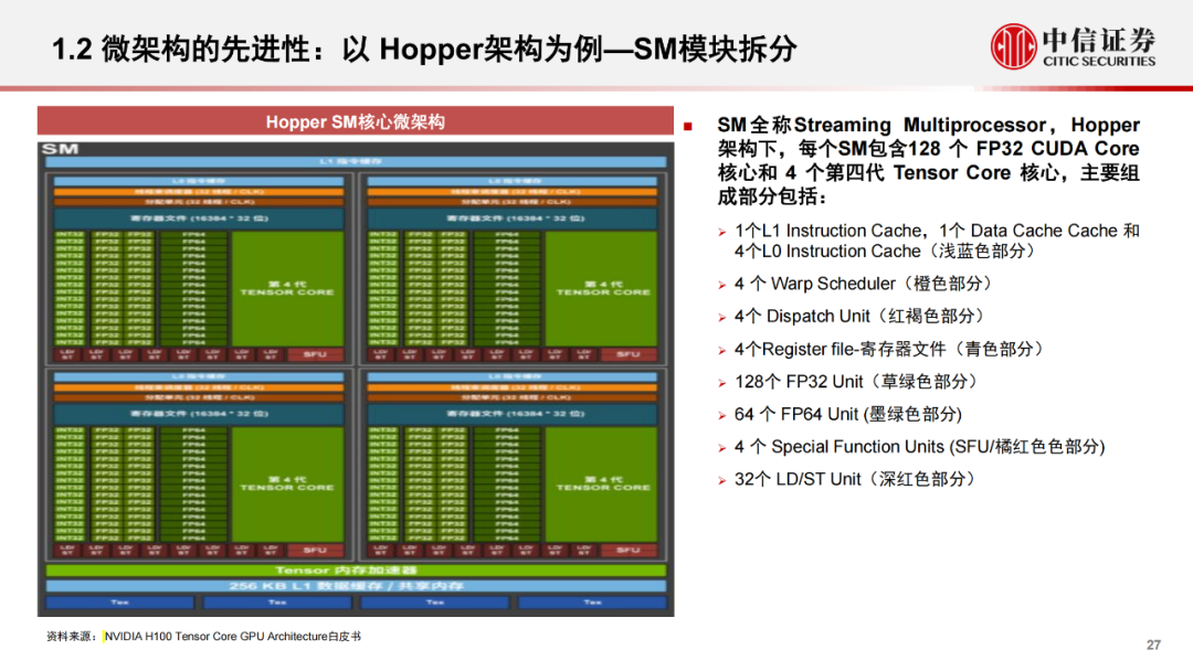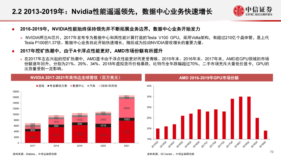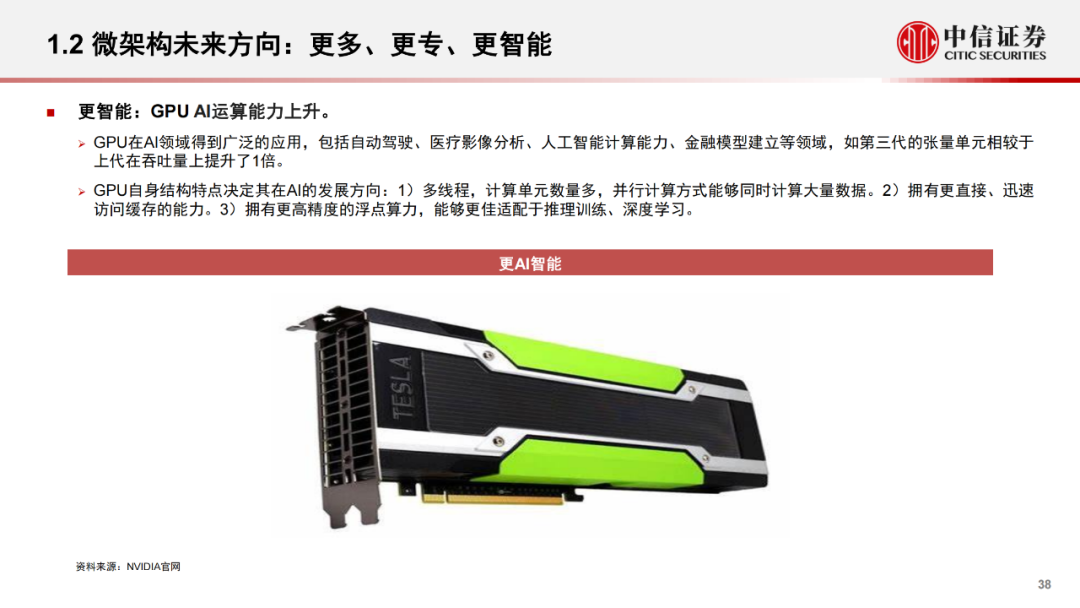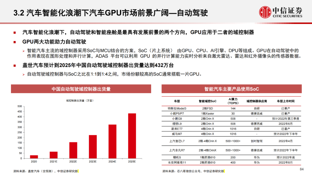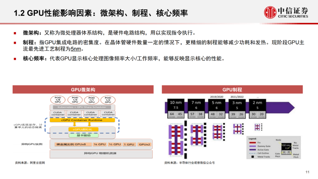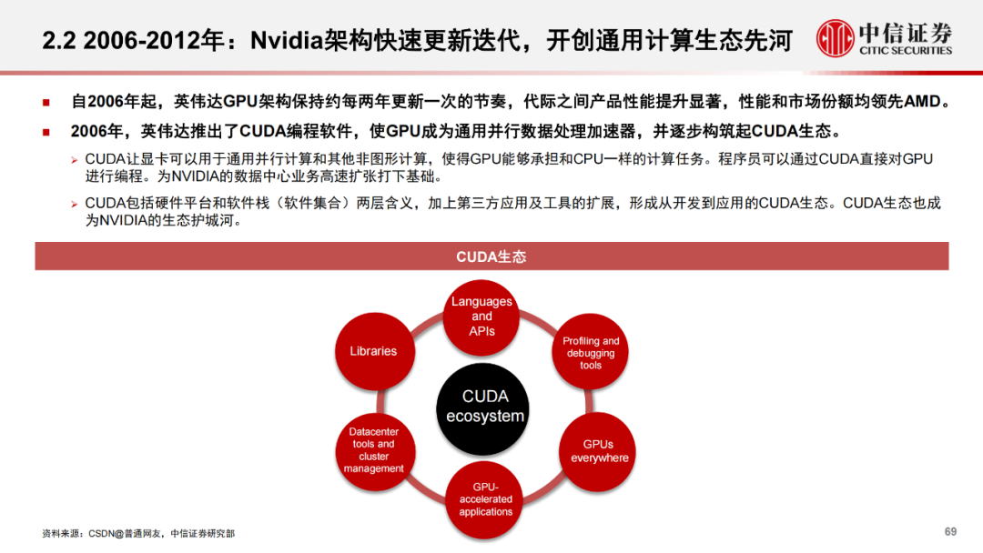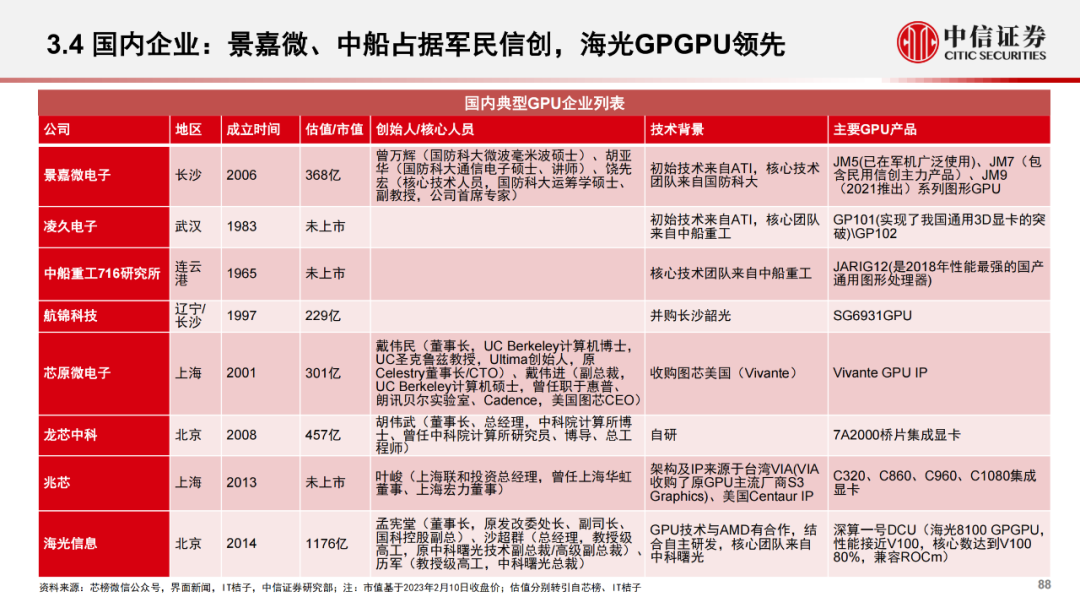 国内GPU厂商纷纷大力投入研发快速迭代架构,推动产业开放构建自主生态,加速追赶全球头部企业。国产替代需求持续释放叠加国际局势不确定性加剧,AI&数据中心、智能汽车、游戏等GPU需求有望高增,国产GPU迎来发展黄金期,我们看好国产GPU公司的发展与投资机遇。第一,我们从性能和生态2个维度构建了GPU完整的研究体系。1)性能:决定GPU是否“高效”,其中微架构/制程是影响GPU性能的核心要素。2)生态:CUDA构筑通用计算坚固壁垒。第二,提出在评估GPU性能的指标的重要性上:微架构、制程、流处理器数量、核心频率对GPU性能影响较大。我们详细梳理了GPU的微架构、制程、显存容量/位宽/带宽/频率、核心频率等各类性能参数及重要性程度,并利用“核心数*核心频率*2”公式对性能算力进行量化,揭示可用3DMark、MLPerf 等GPU软件跑分进行相关性能测试评估。第三,详细拆解了NVIDIA Fermi和Hopper两大典型微架构的具体硬件实现,在顶点处理、光栅化计算、纹理贴图、像素处理的图形渲染流水线上对Fermi架构进行了拆分;在指令接收、调度、分配、计算执行的通用计算流水线上对Hopper架构进行了简单易懂的描述,并指明更多、更专、更智能等未来架构升级迭代的方向。第四,明晰了生态是构建通用计算壁垒的基石。提出GPU研发难度在图形渲染硬件和通用计算软件生态层面,在IP、软件栈方面研发门槛较高,需要较长的积累,先发者优势明显。CUDA生态从2006年推出至今,经过不断发展完善,几乎已在行业生态内处于垄断地位。第五,深度复盘Nvidia/AMD(ATI)的产品迭代和竞争发展史,通过对NVIDIA长期保持领先和AMD(ATI)反超进行总结得出结论:架构创新升级和新兴领域前瞻探索是领跑GPU行业的关键。 第六,梳理和测算了国内GPU在AI&数据中心、智能汽车、游戏行业的市场空间和发展趋势。